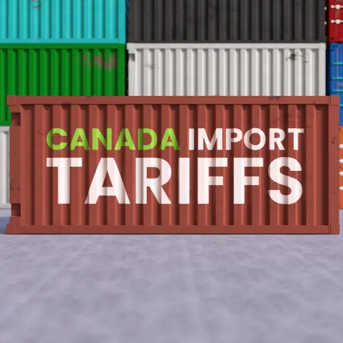 Canada Import Tariffs Label on Shipping Container Representing Global Trade Tensions