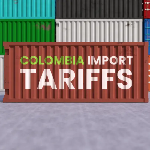 Colombia Import Tariffs Label on Shipping Container Representing Global Trade Tensions