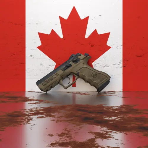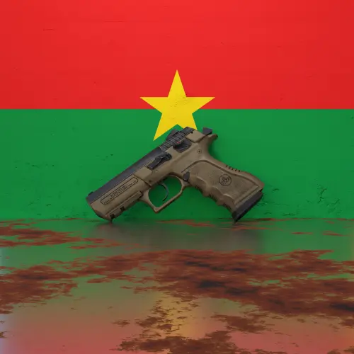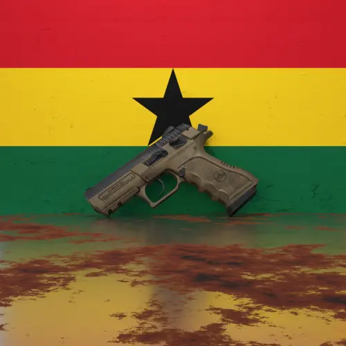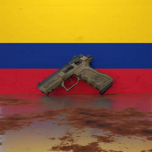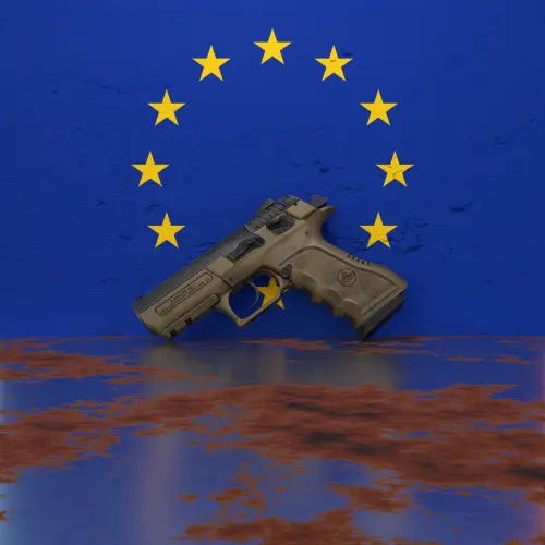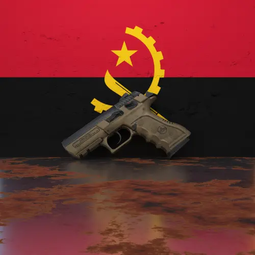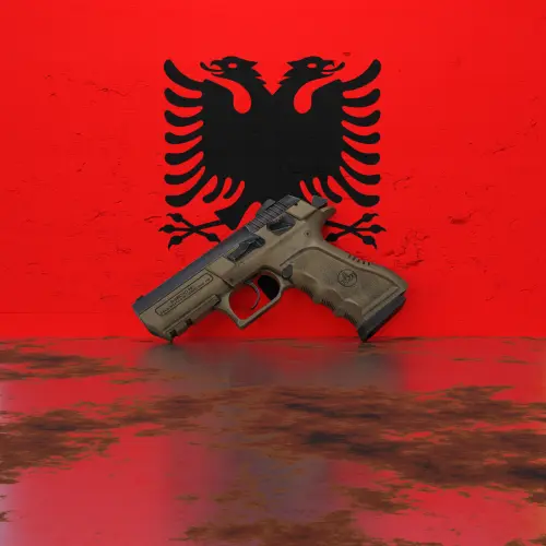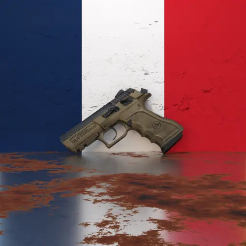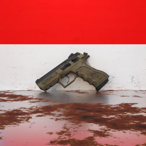 A pistol in front of a wall featuring the flag of Azerbaijan