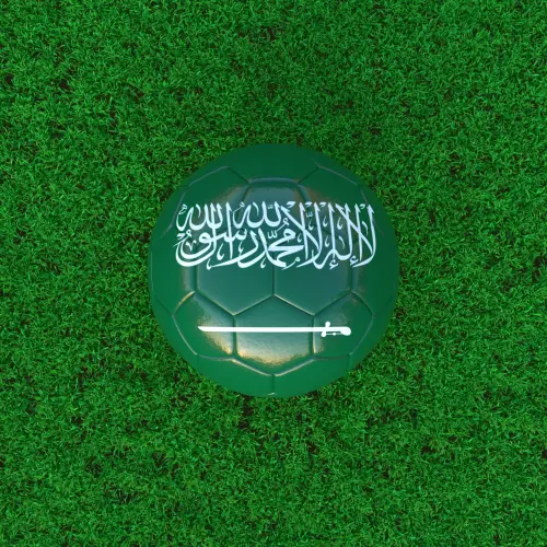 Flag Of Saudi Arabia On Soccer Ball With Grass Background