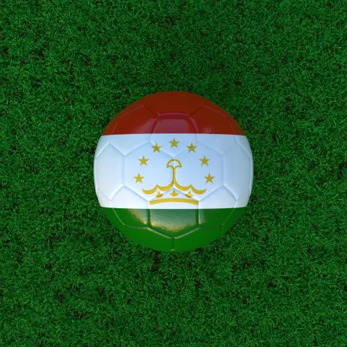 Flag of Tajikistan on a Soccer Ball with a Grass Background