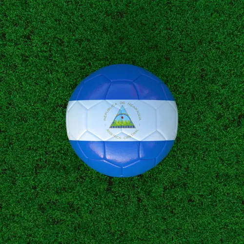 Flag of Nicaragua on a Soccer Ball with a Grass Background