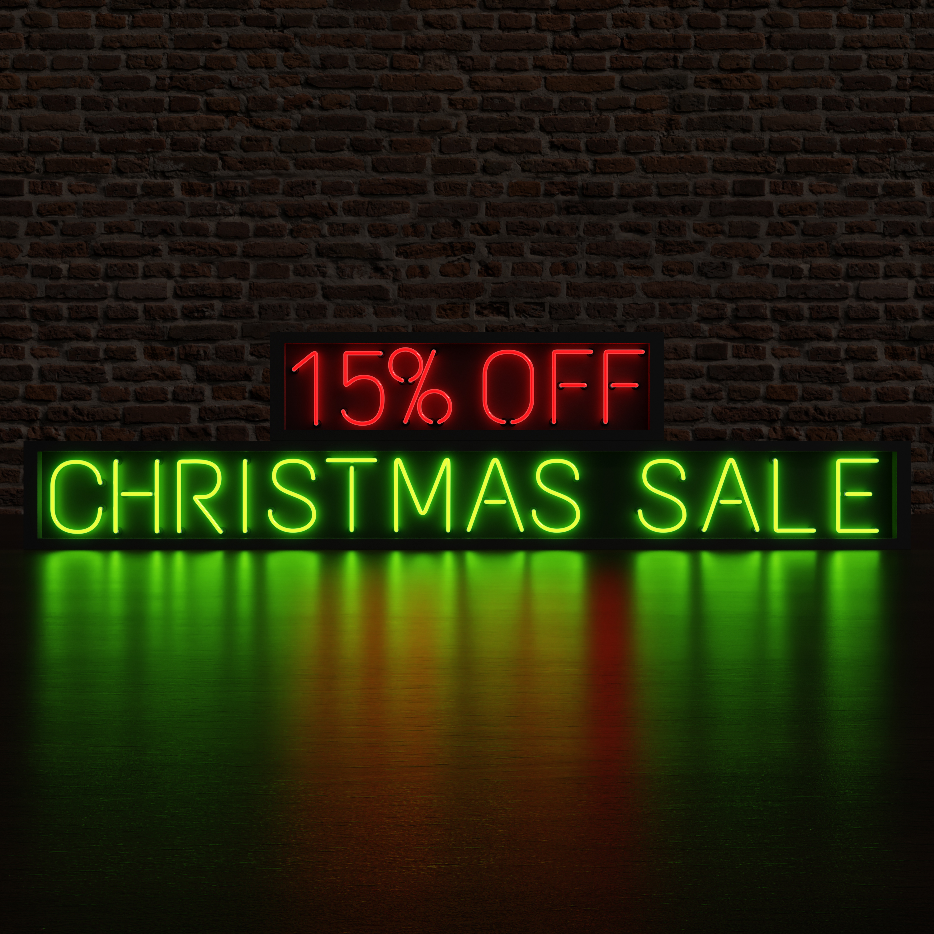 10 to 95 Percent Off Christmas Sale Neon Sign on Brick Wall