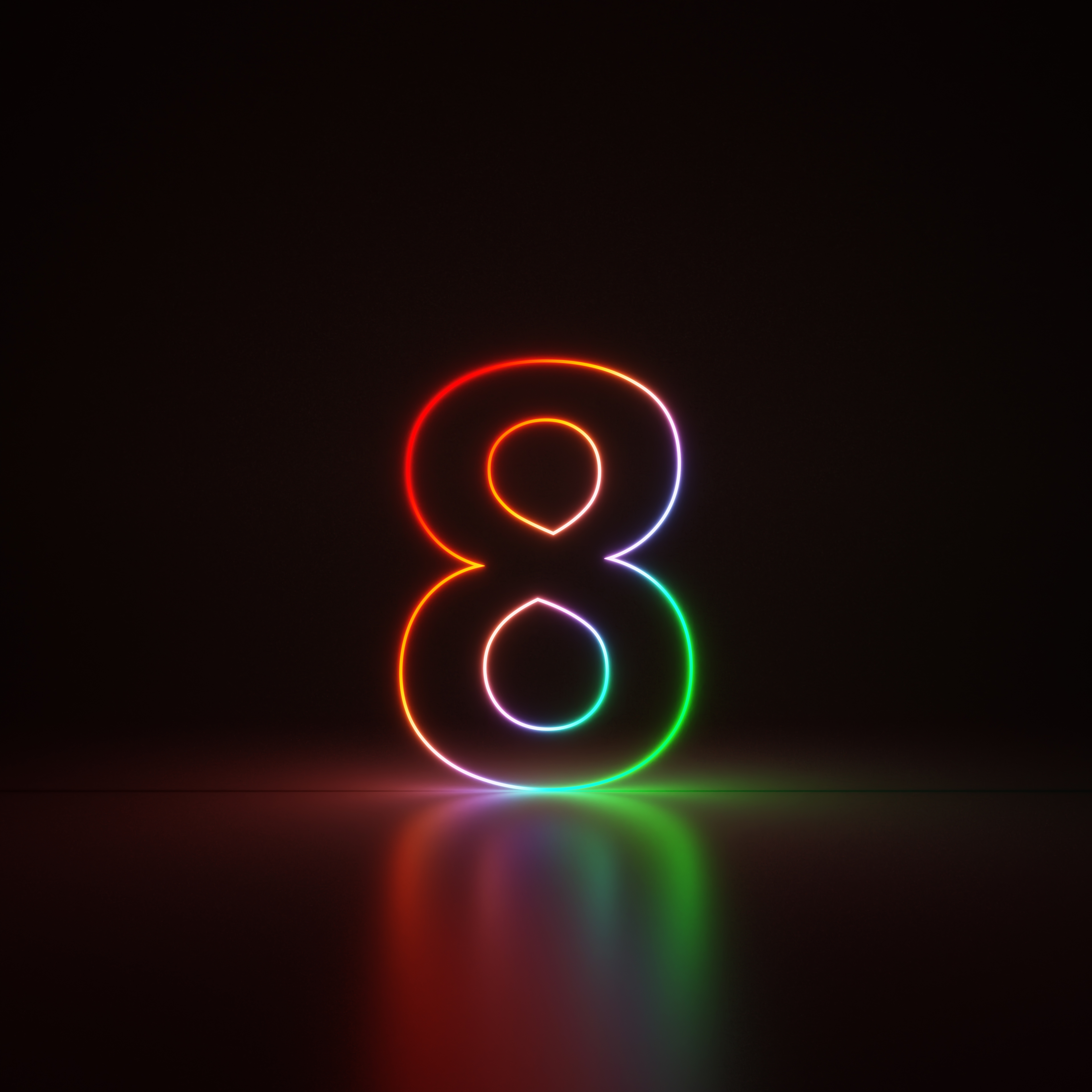 3d Render, Number 8 Glowing in the Dark, Gradient Neon Light
