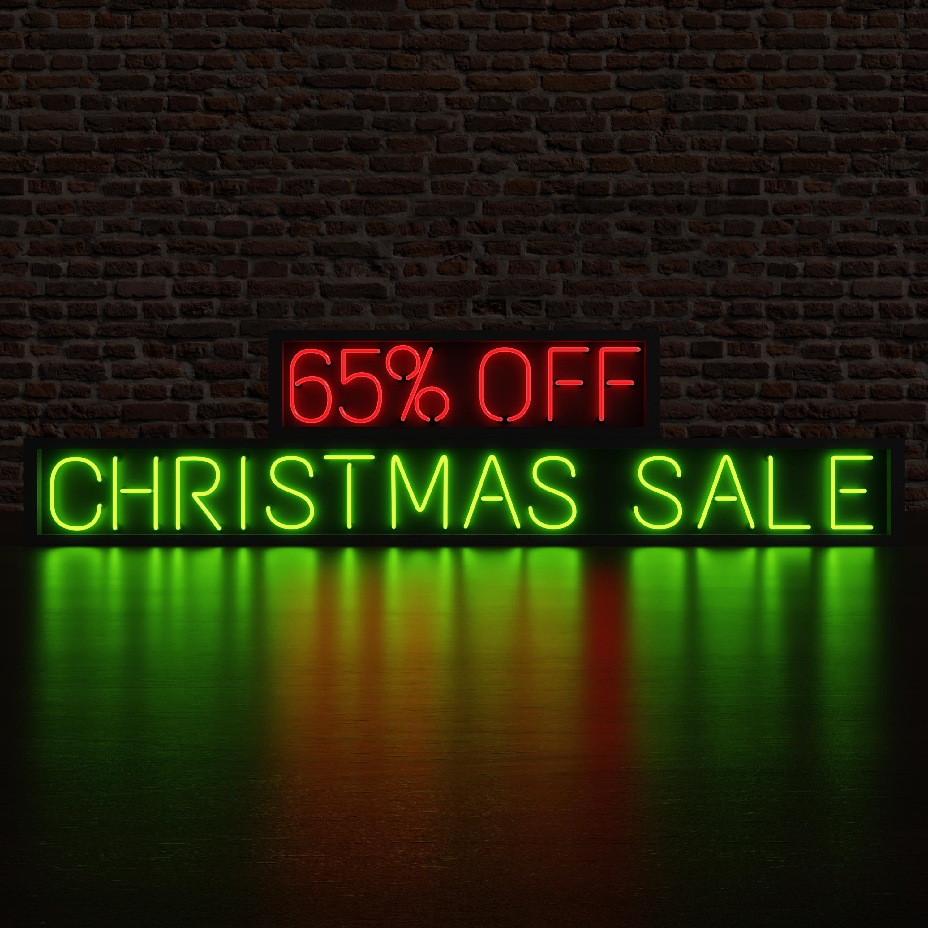 10 to 95 Percent Off Christmas Sale Neon Sign on Brick Wall