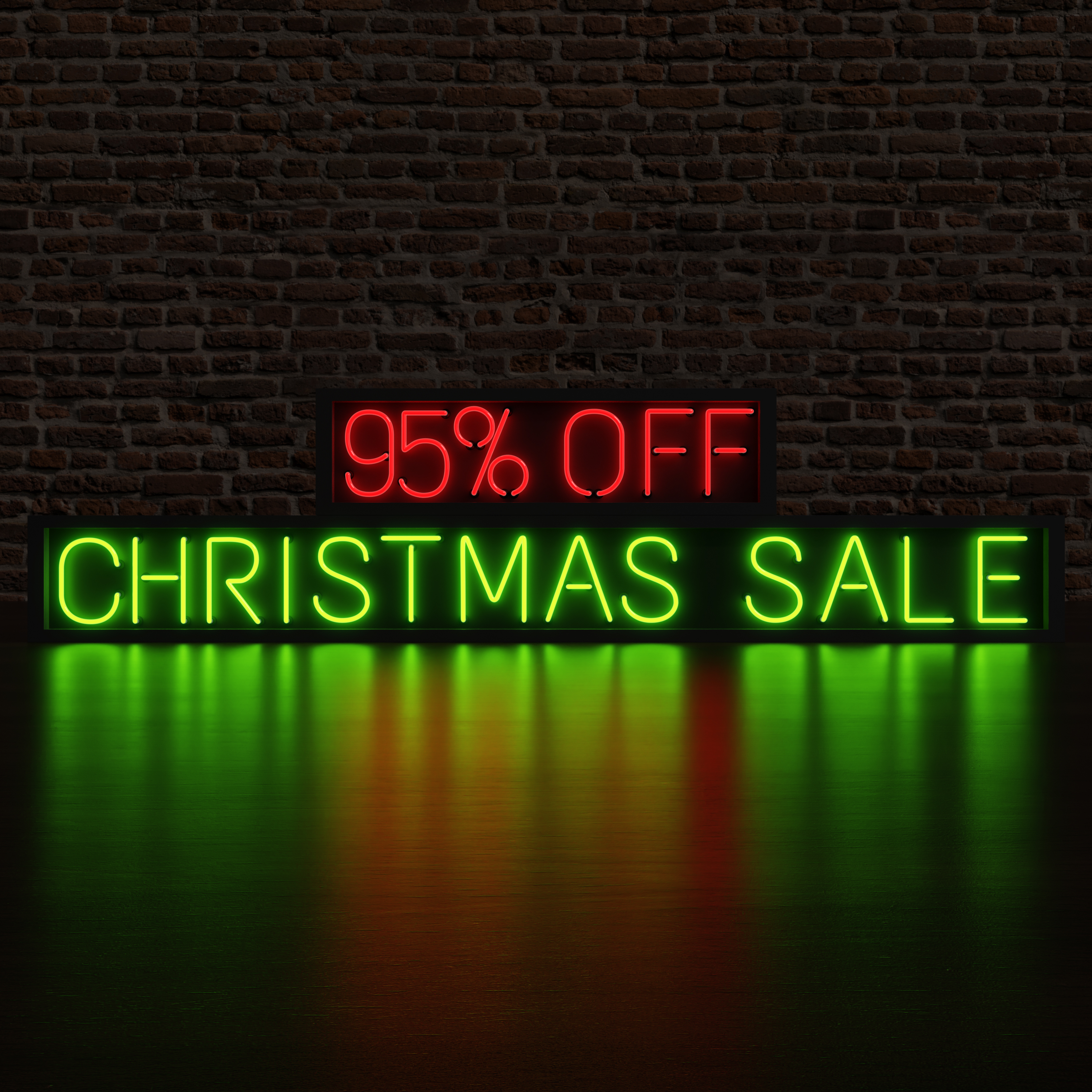 10 to 95 Percent Off Christmas Sale Neon Sign on Brick Wall