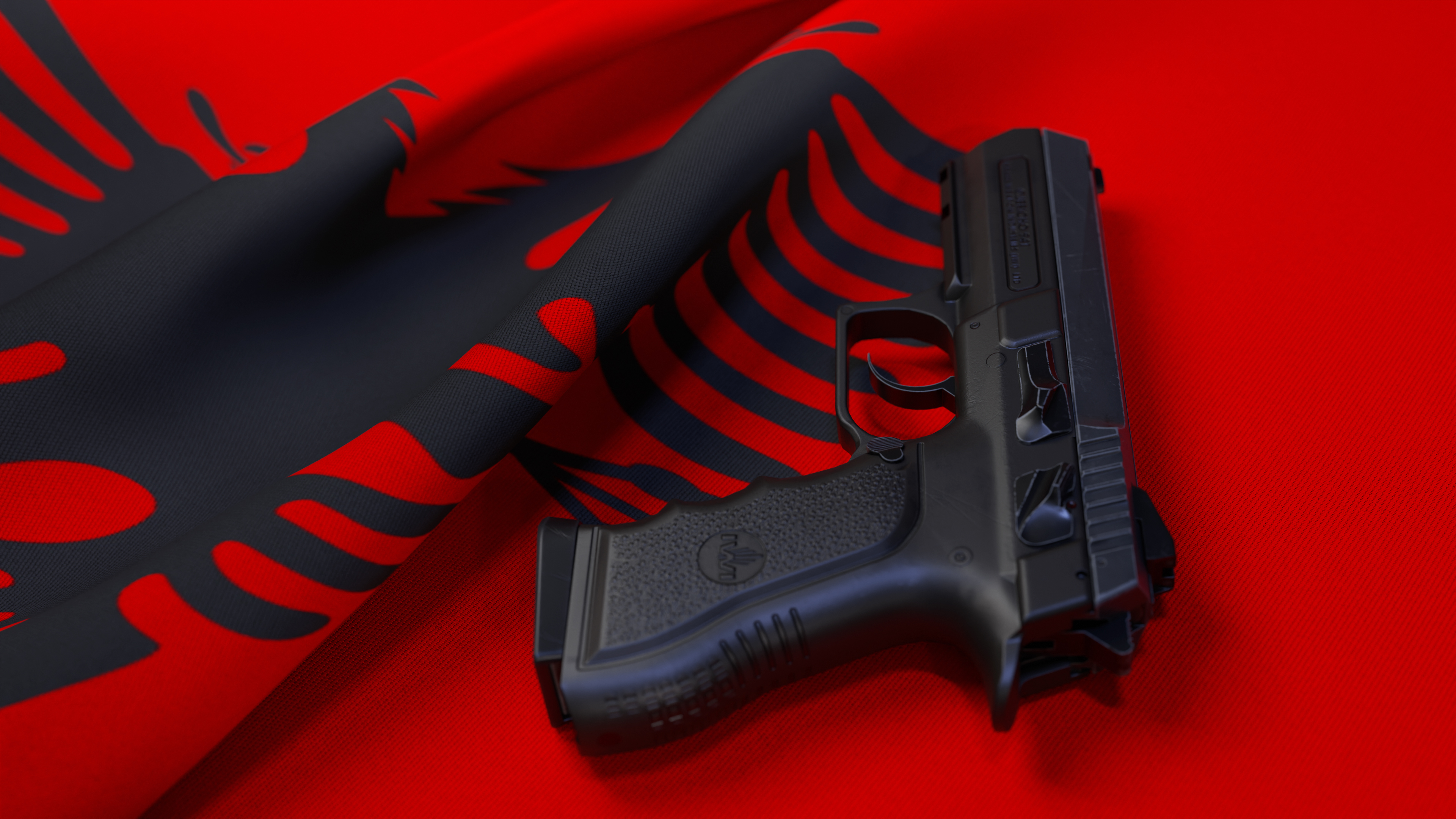 A black pistol on the flag of Albania