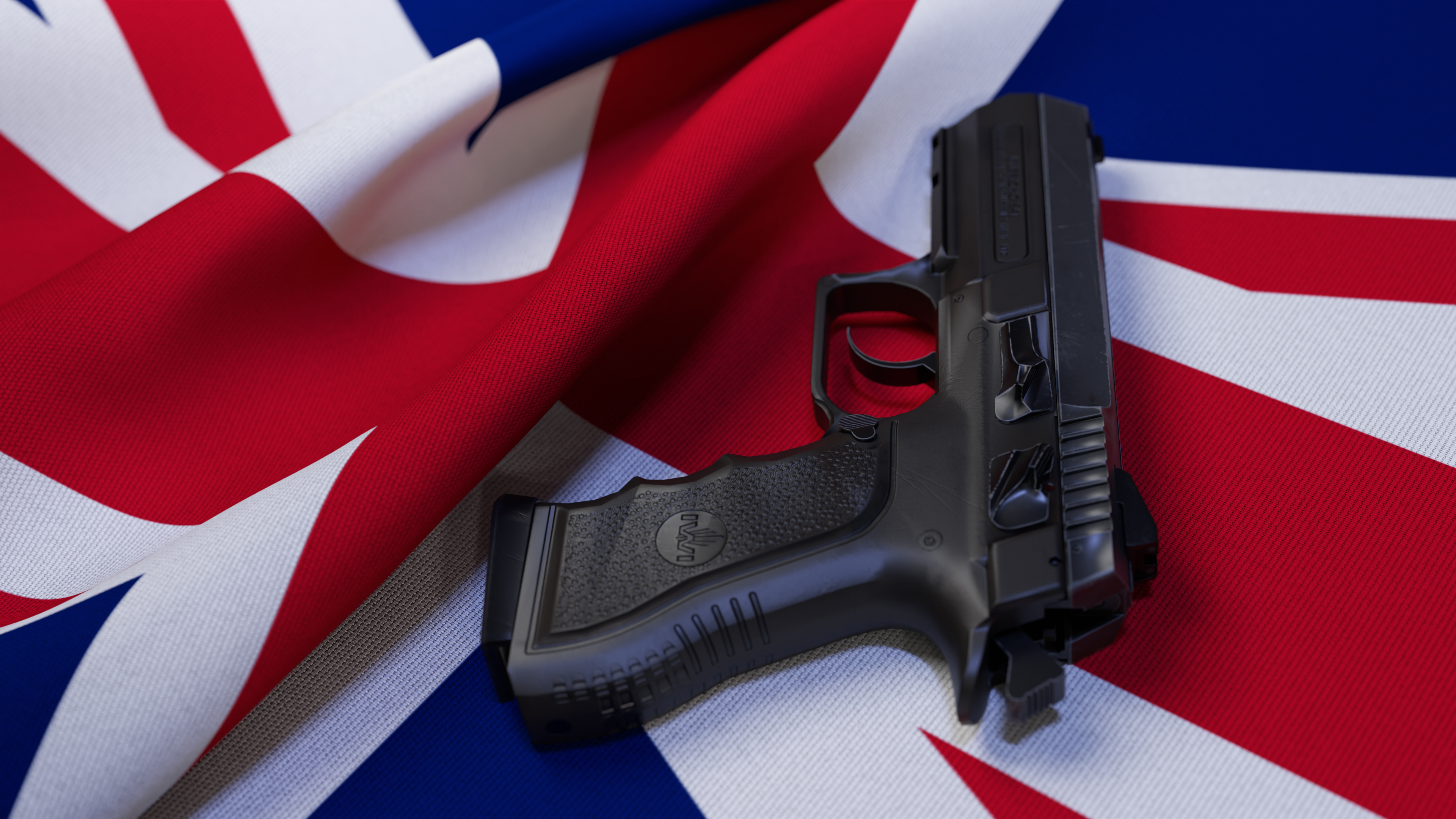 A black pistol on the flag of United Kingdom