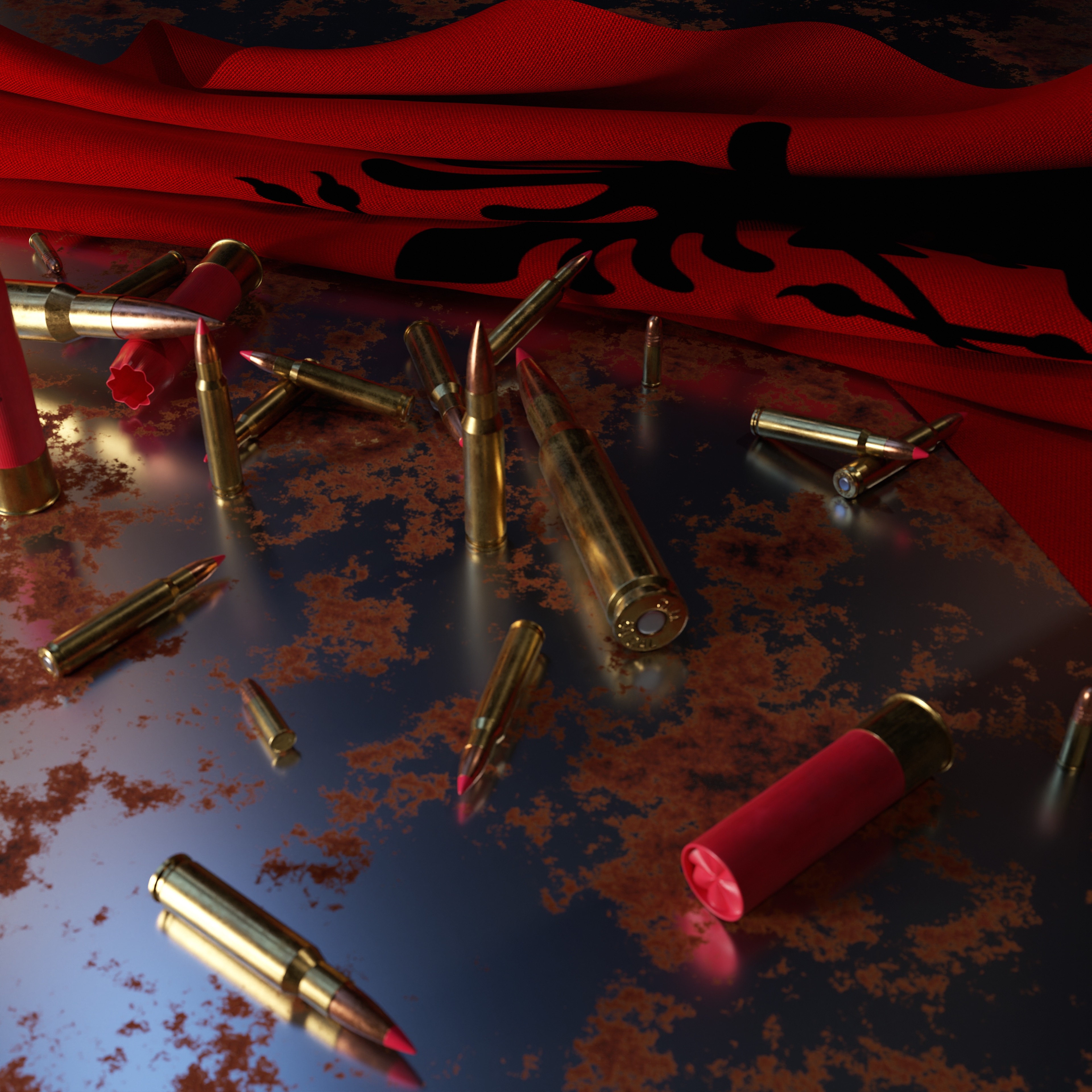 National Flags with Bullets on Rusty Metal Plate