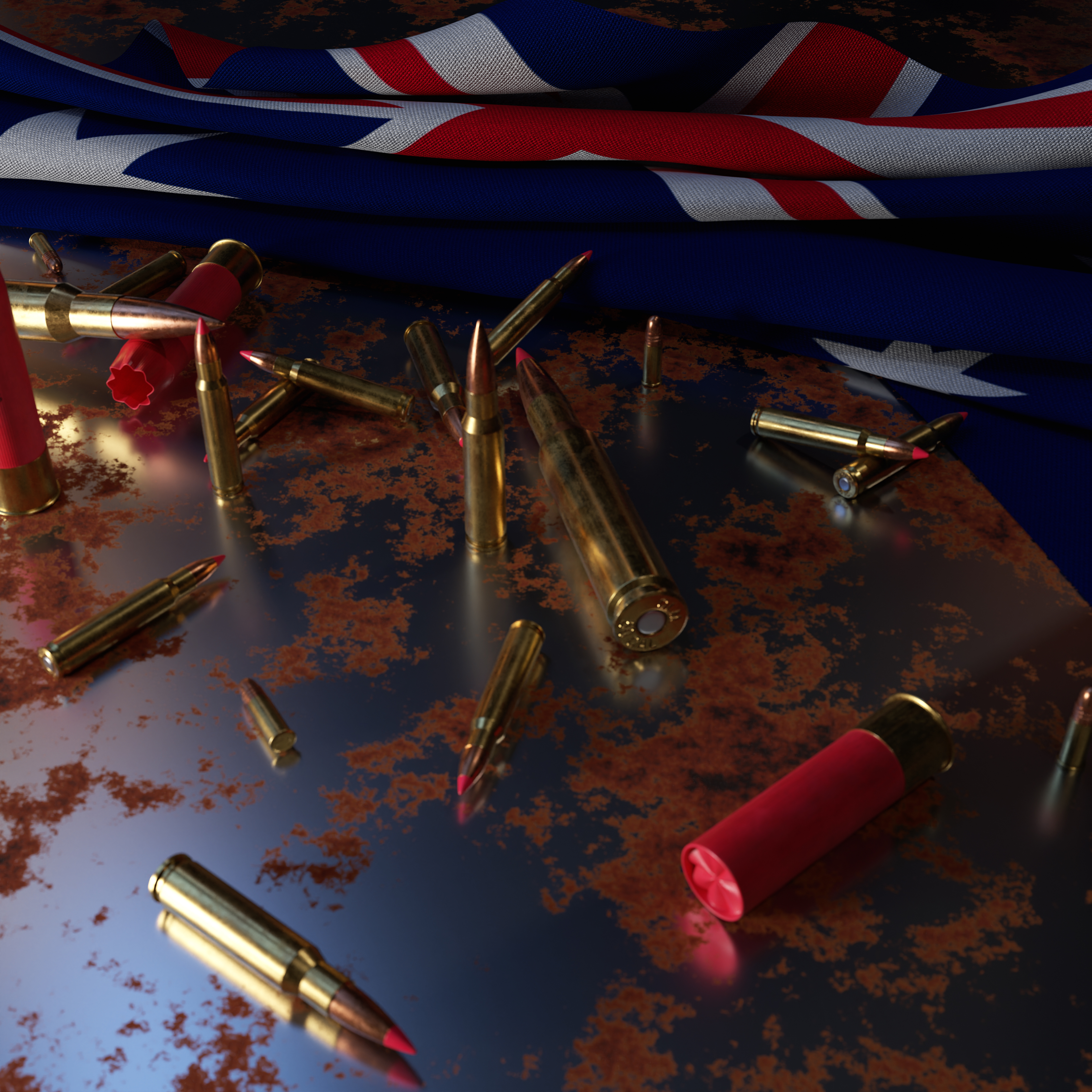 National Flags with Bullets on Rusty Metal Plate