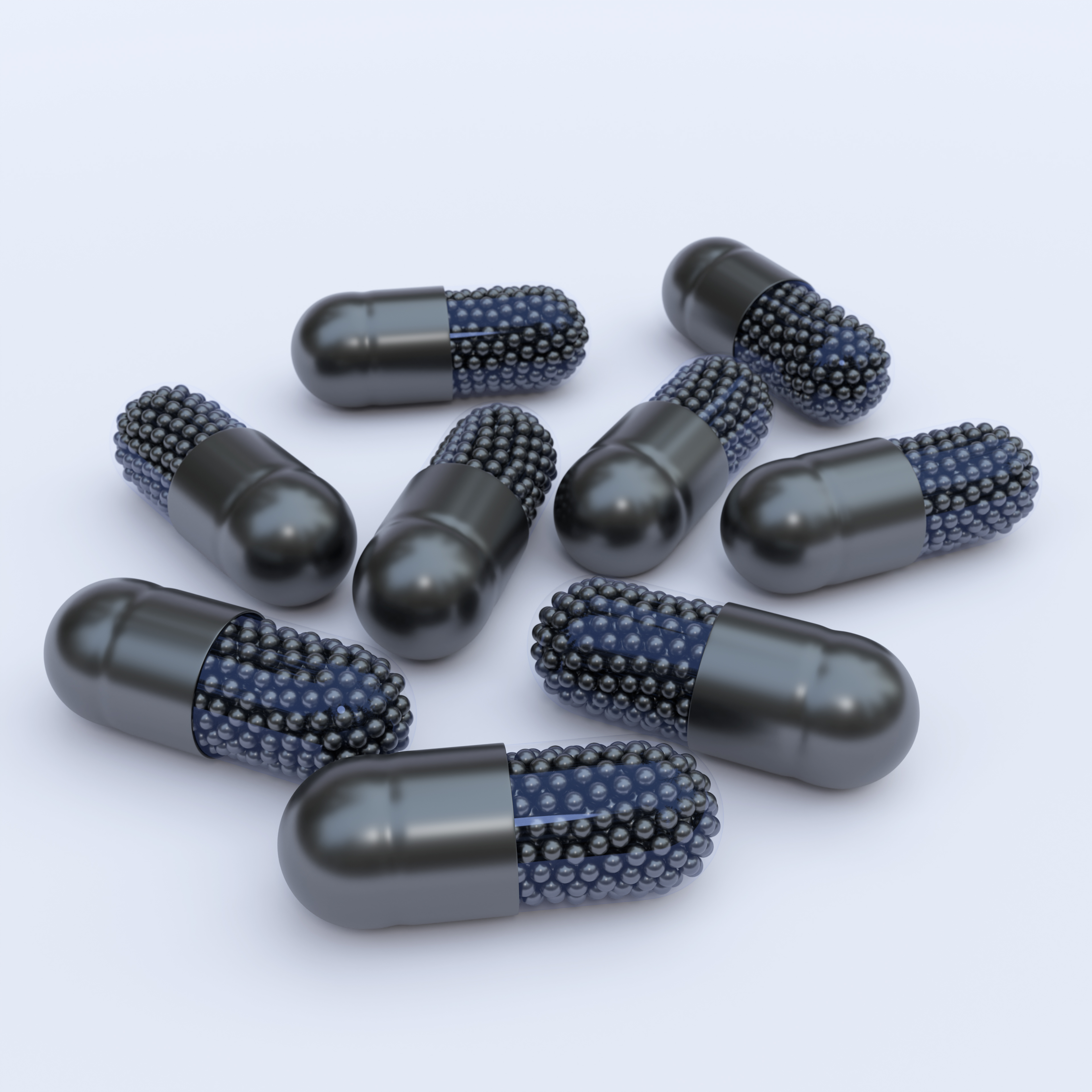 Vitamin B7, Blue Capsules, Granules and Whtie Background