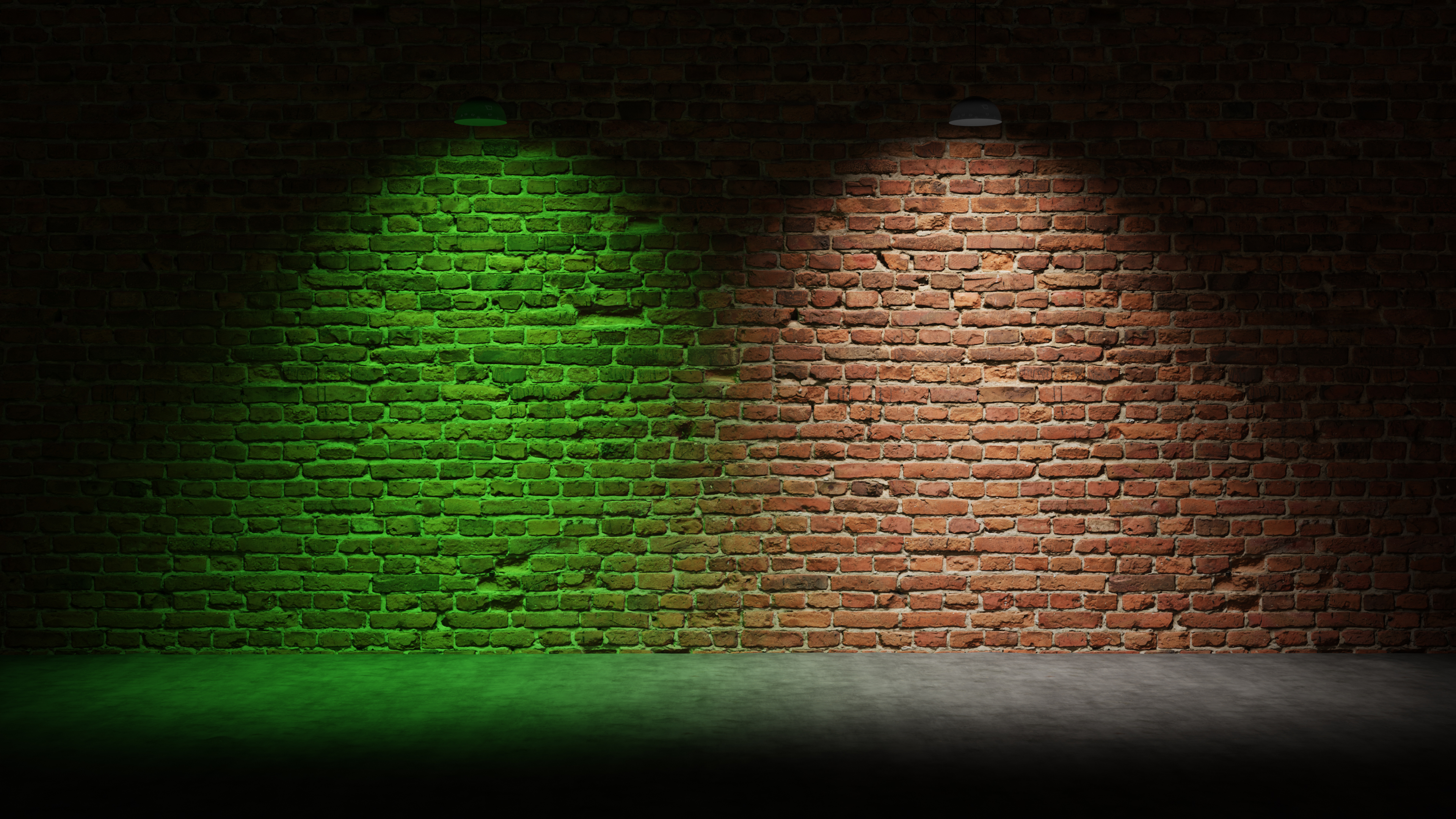 Brown brick wall background with spot lighting effect. Green, White, Red