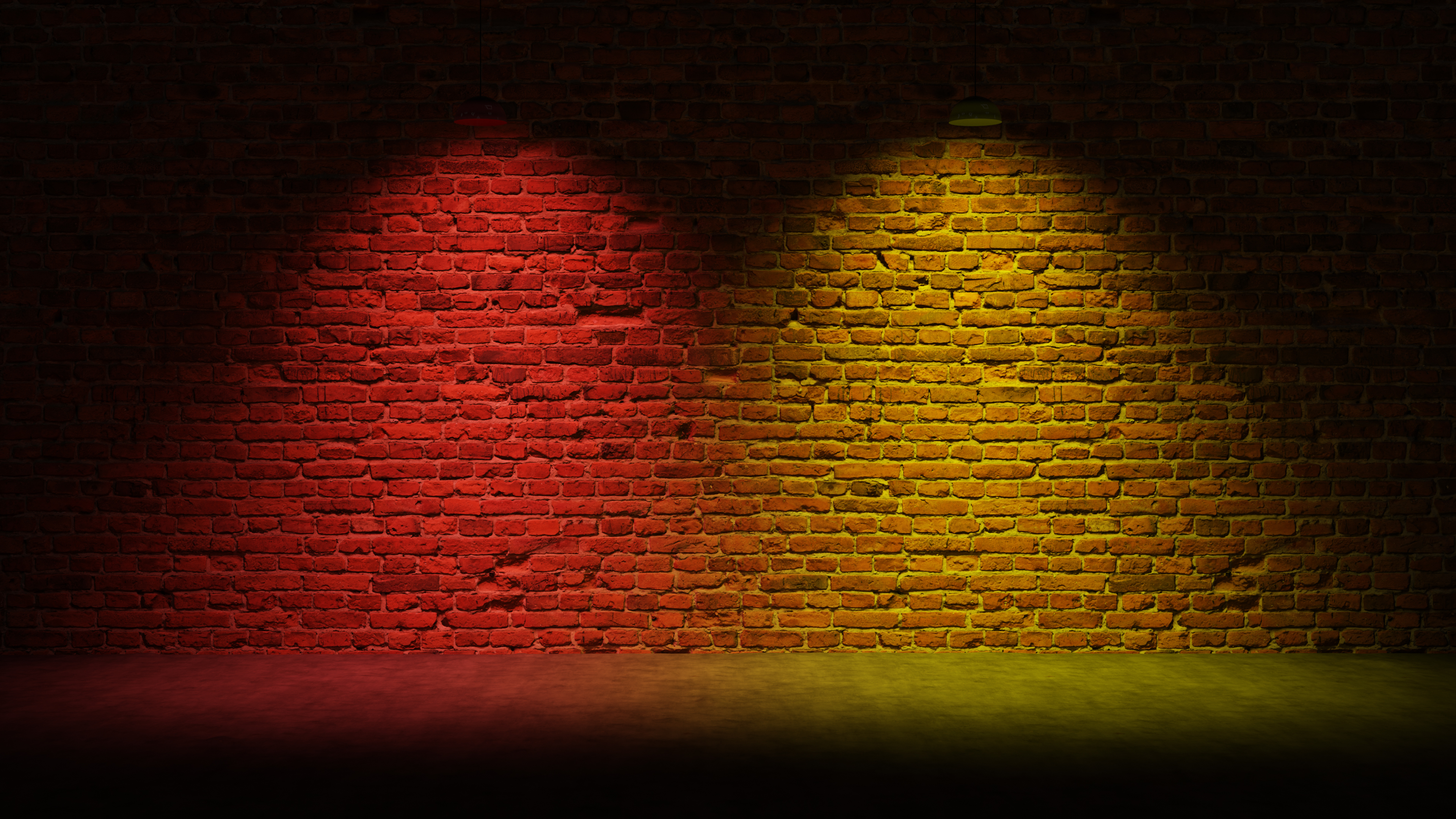Brown brick wall background with spot lighting effect. Yellow, Red