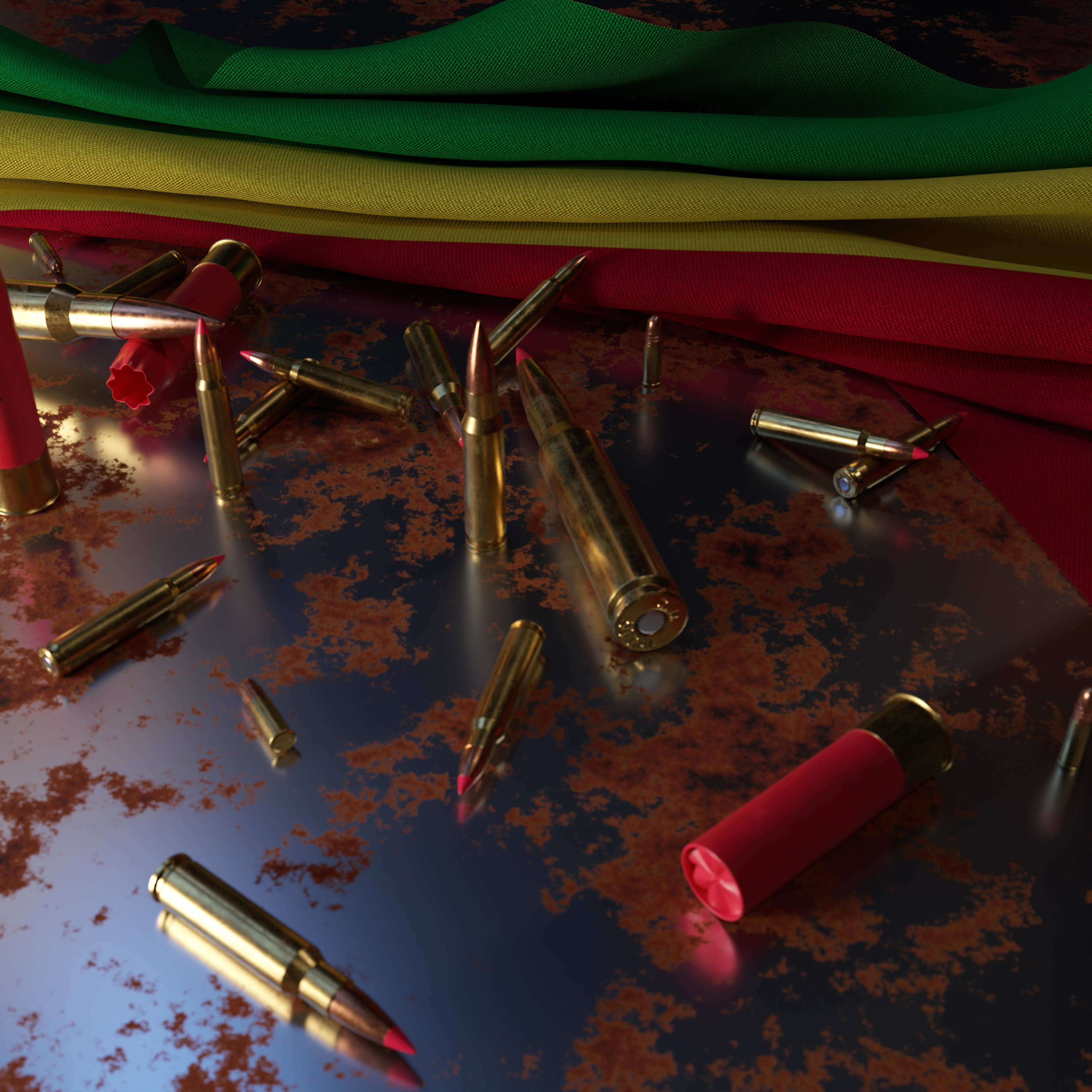 National Flags with Bullets on Rusty Metal Plate