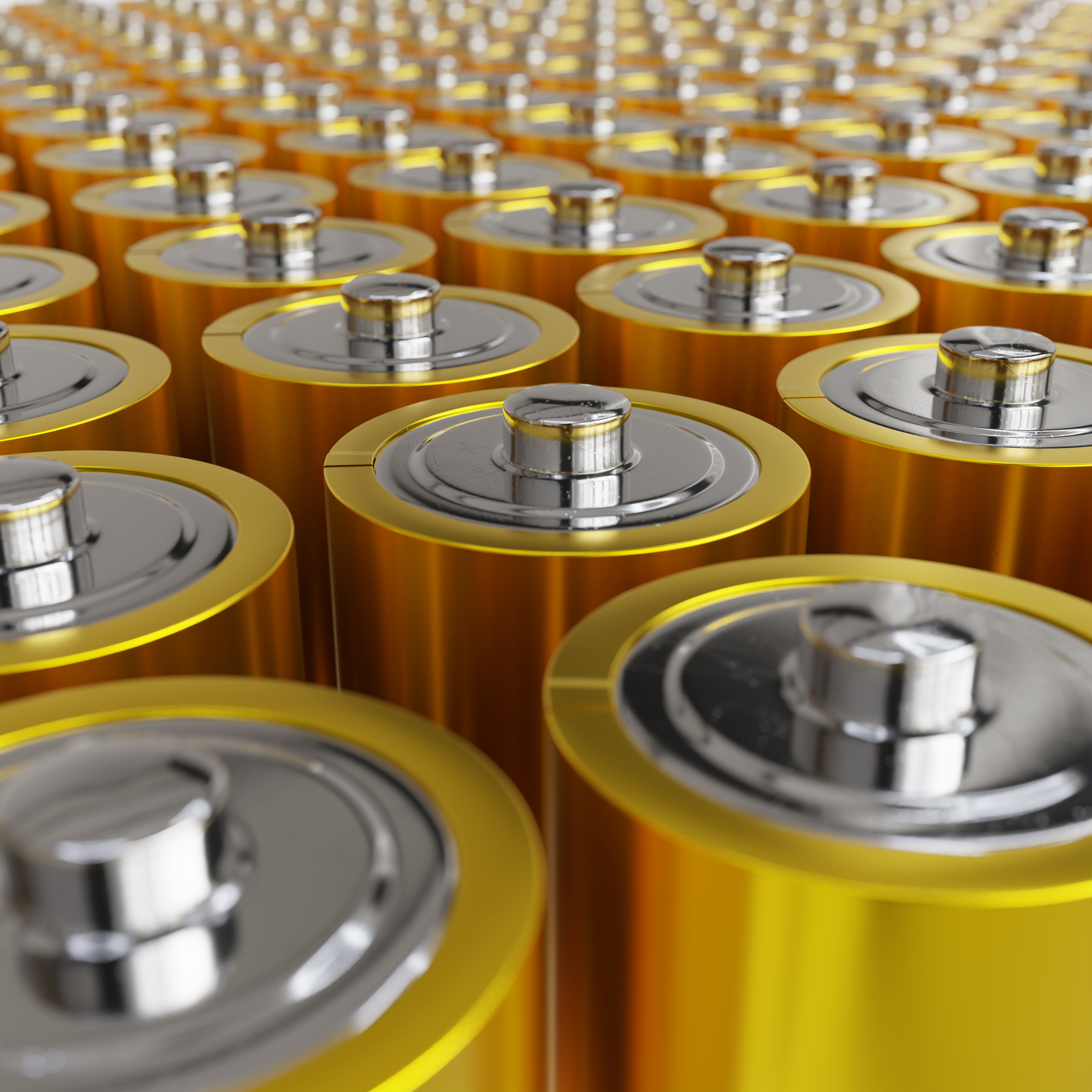 AA Batteries Labeled Fossil Fuel, Green Energy, Thermal Energy, and Nuclear Energy