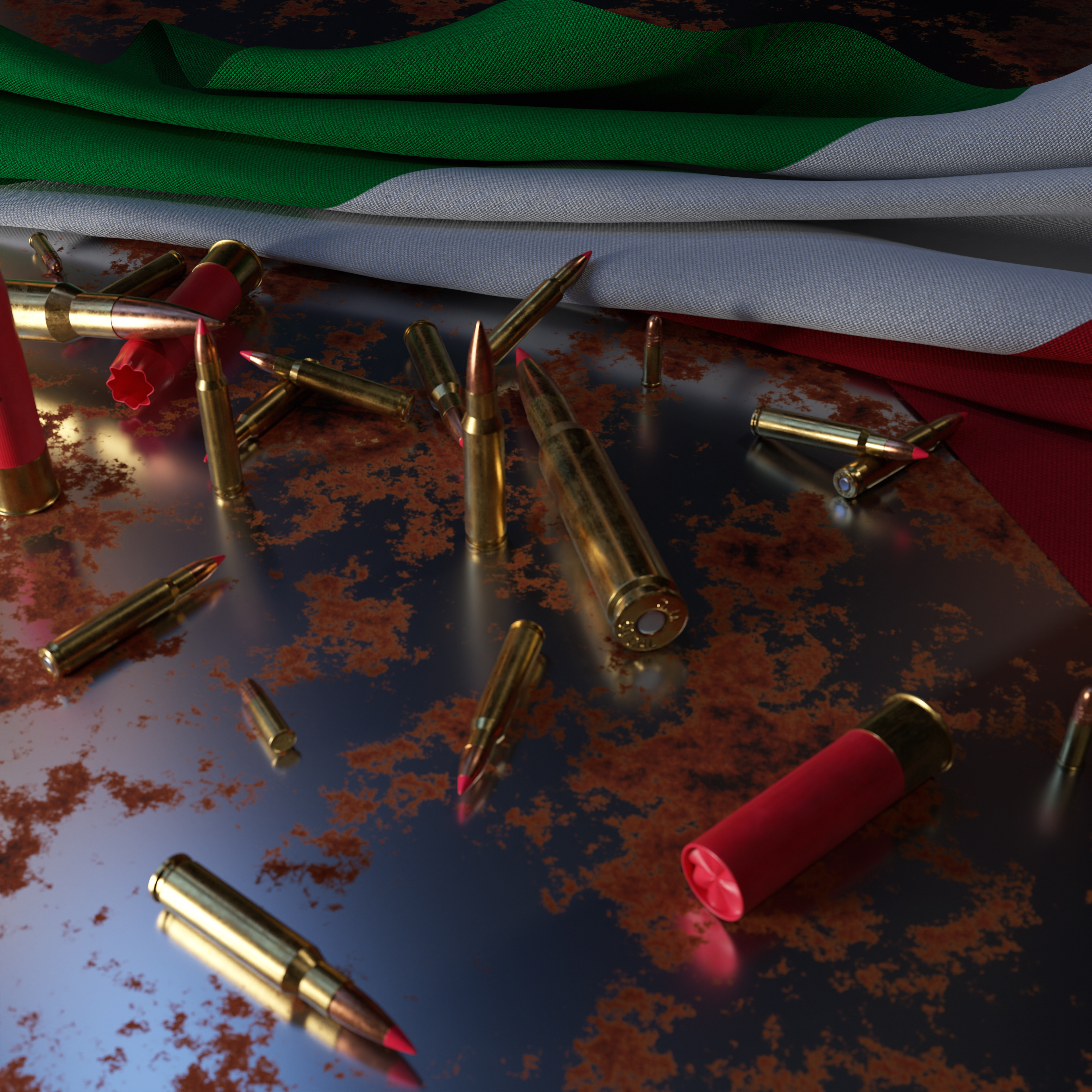 National Flags with Bullets on Rusty Metal Plate
