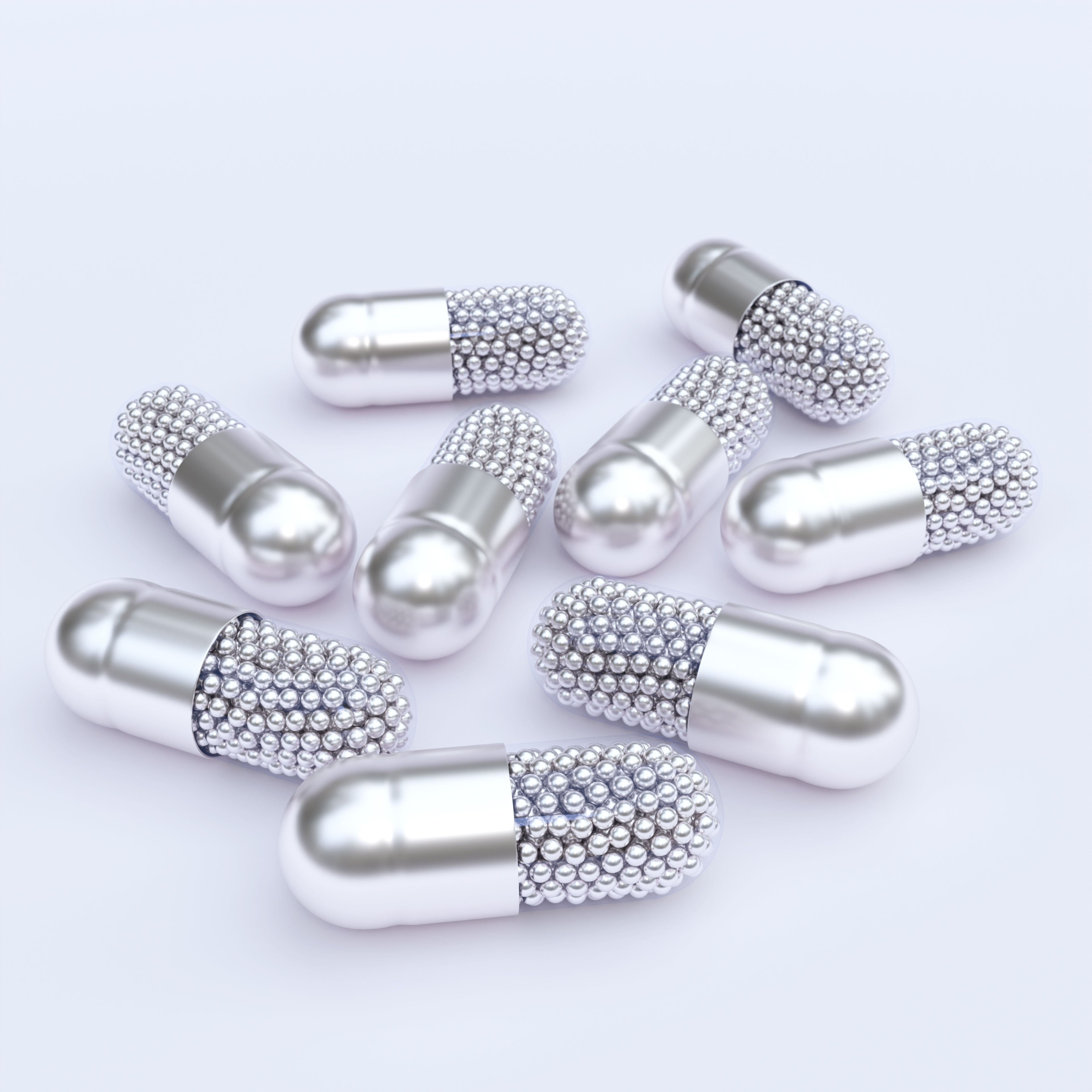 Vitamin B7 With Pink Capsules, Granules and White Background