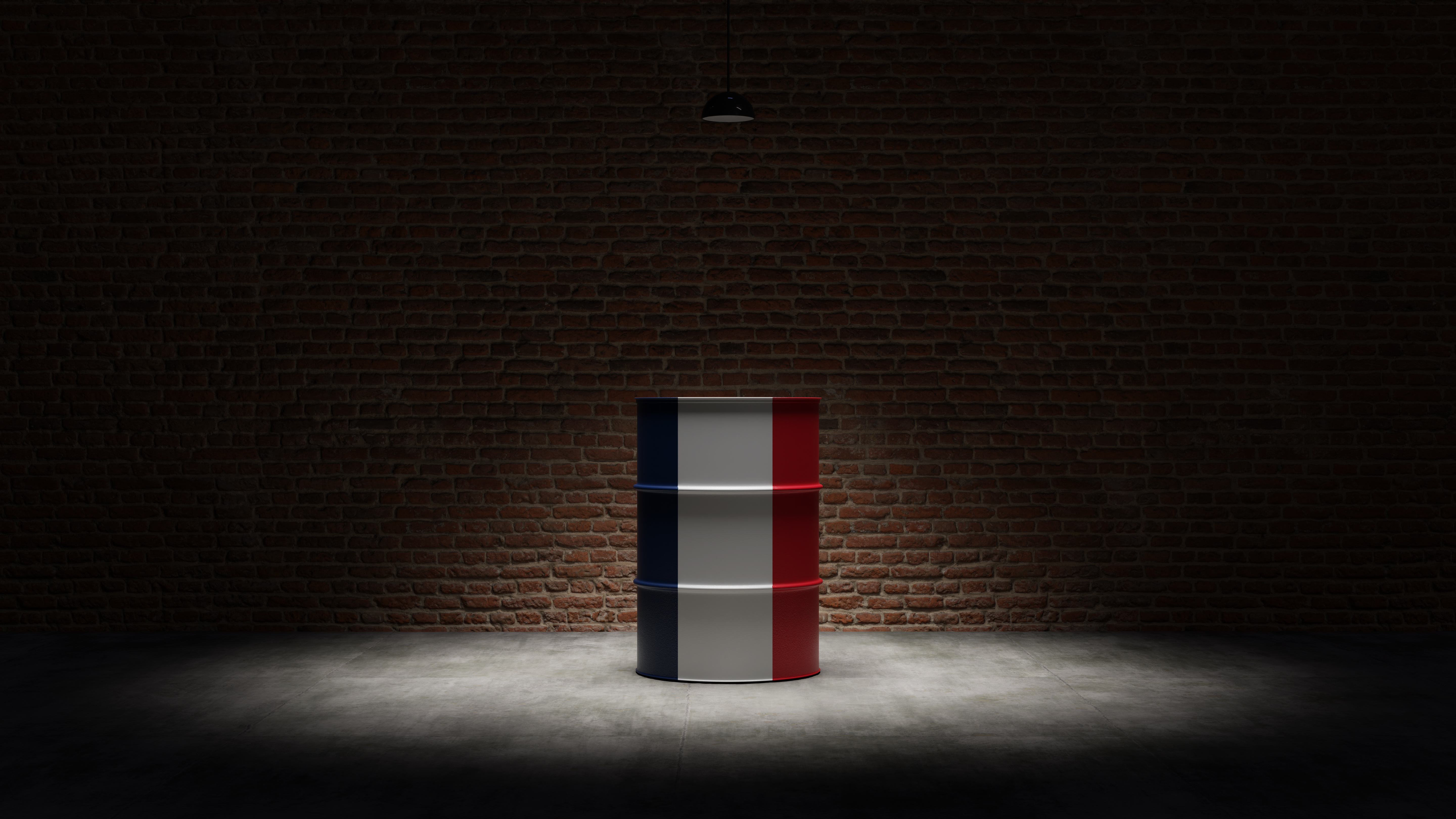 Crude Oil Barrel Wrapped in Flags on Dark Brick Background