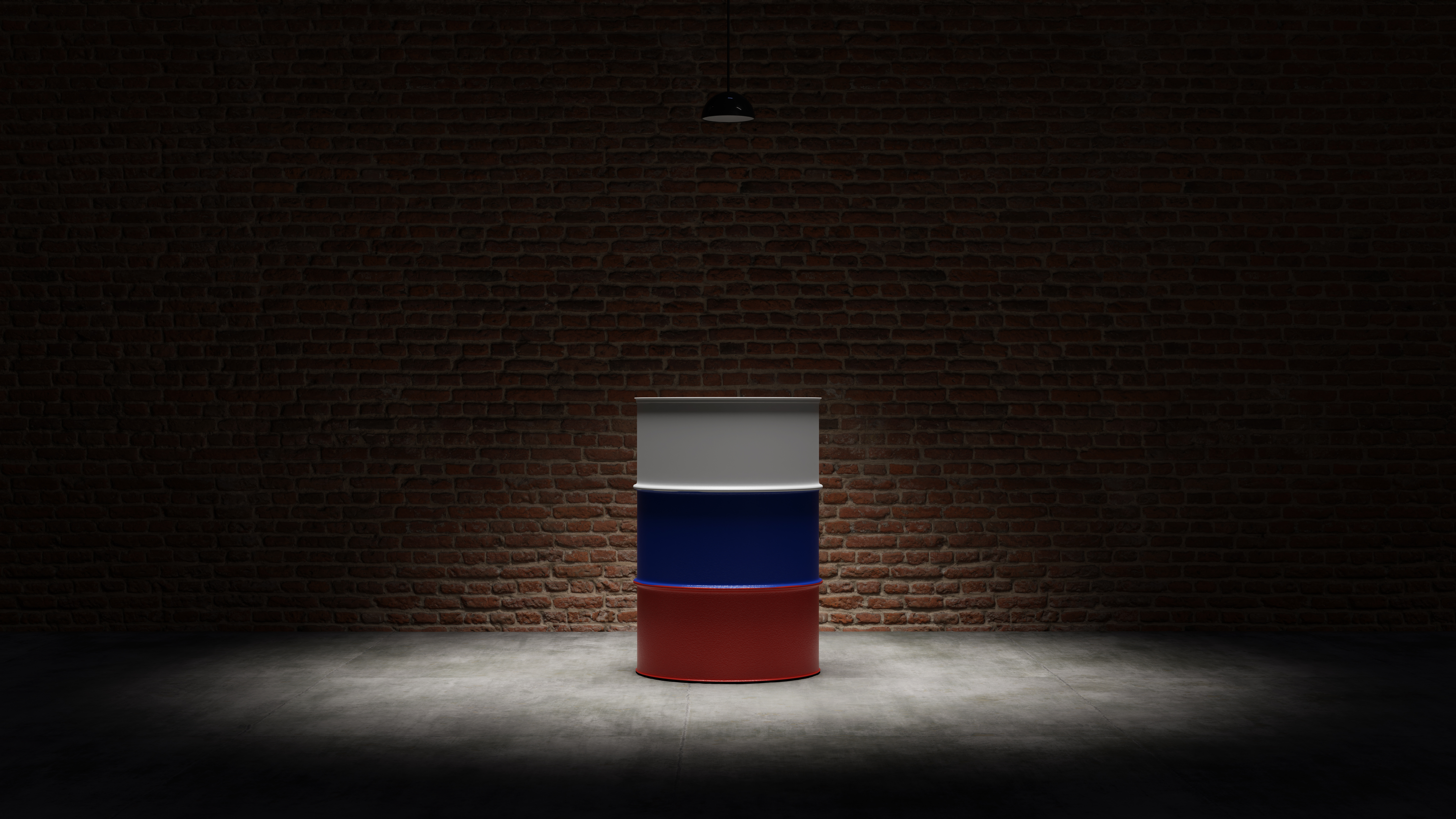 Oil barrel with the flag of Russia in front of a brick background