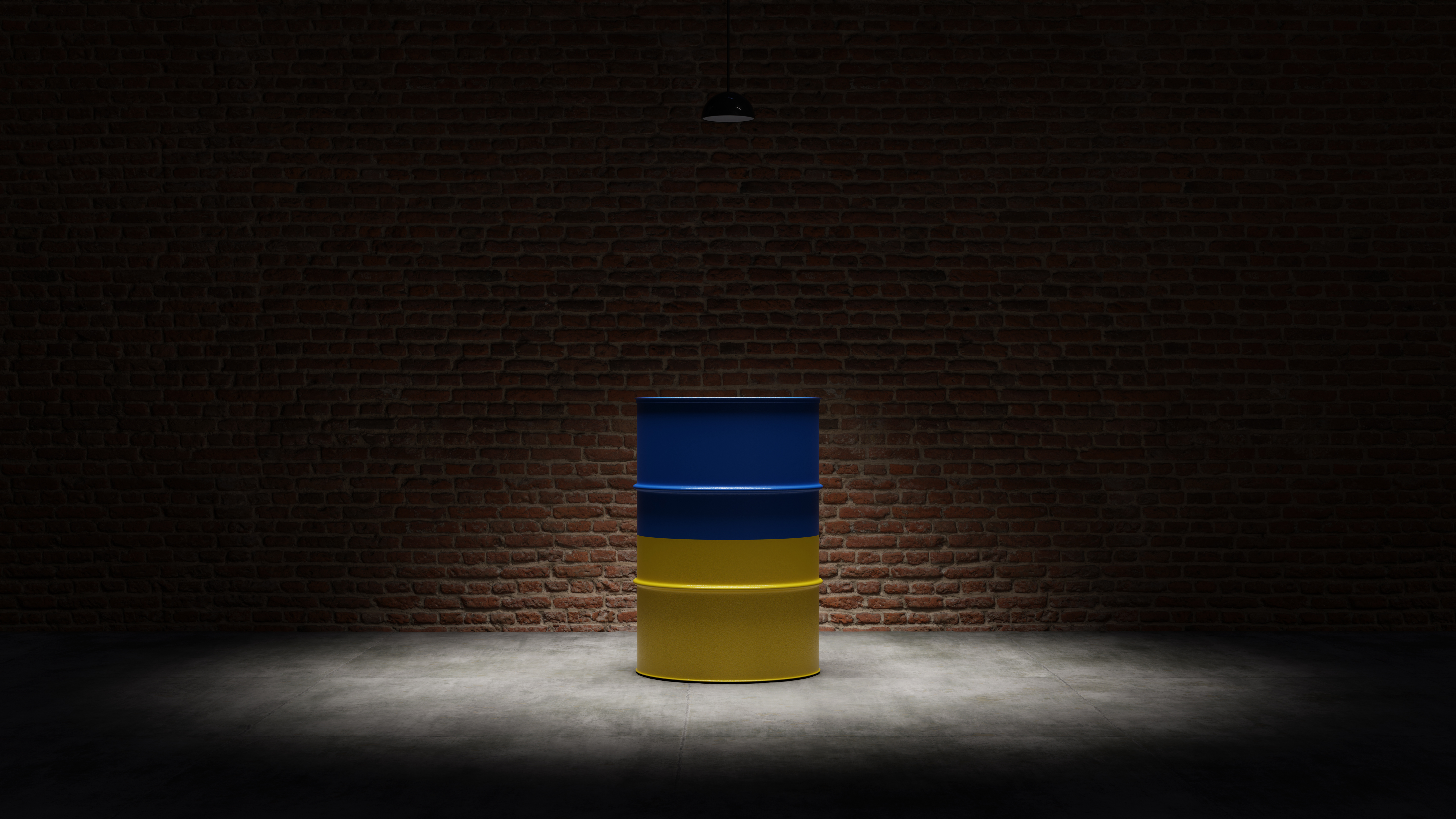 Oil barrel with the flag of Ukraine in front of a brick background