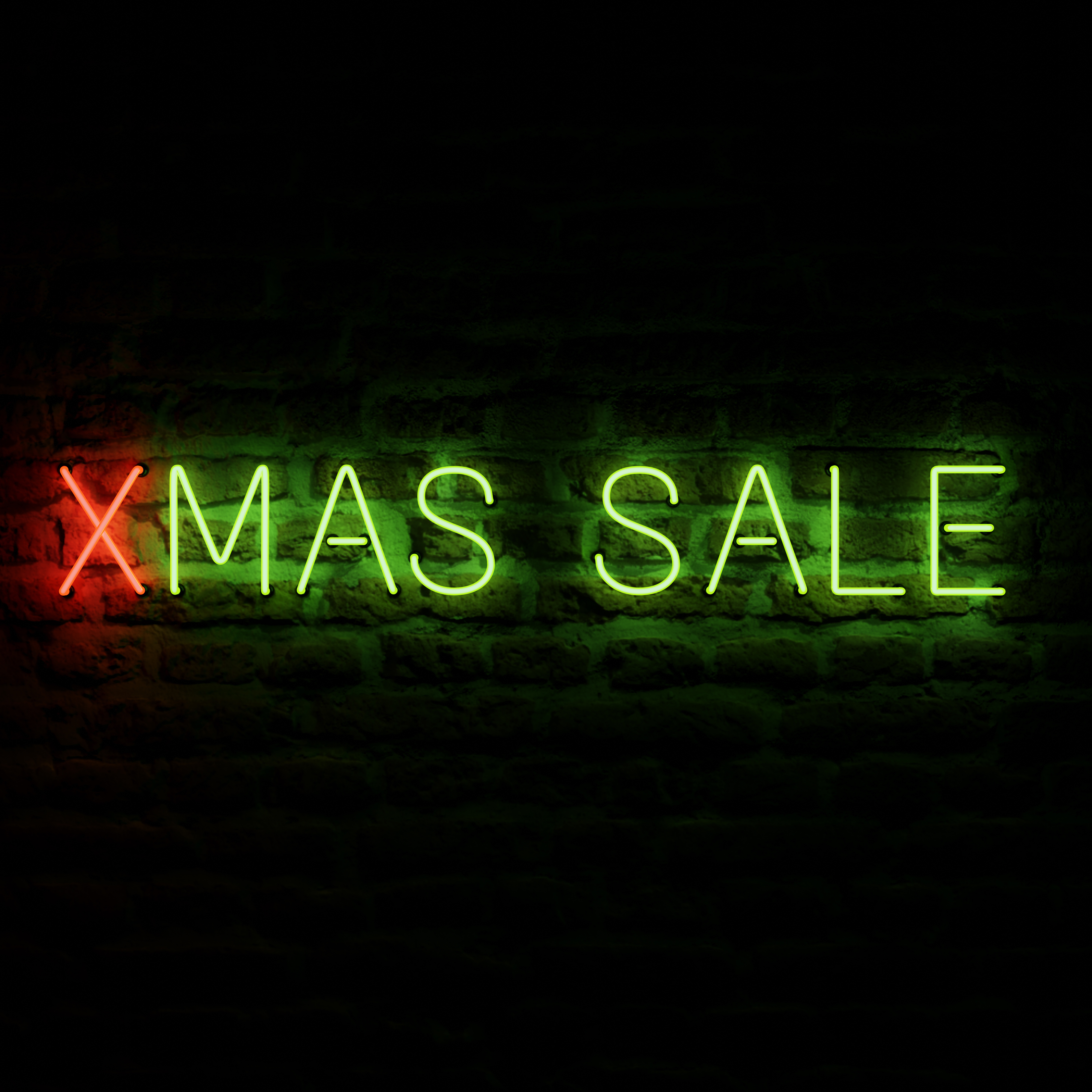10 to 95 Percent Off Xmas Sale Neon Sign on Brick Wall