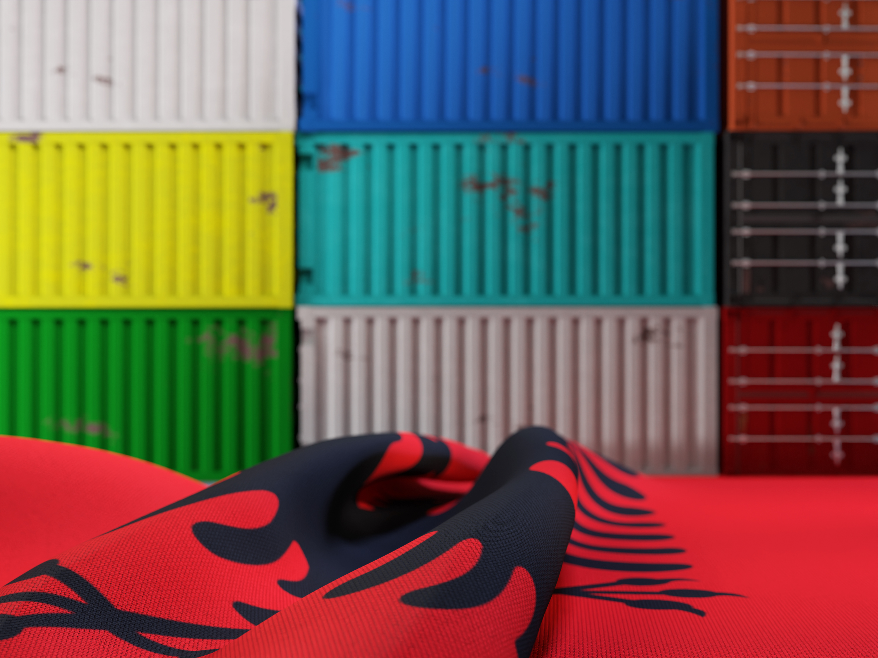Wrinkled Flag of Albania in Front of Shipping Containers