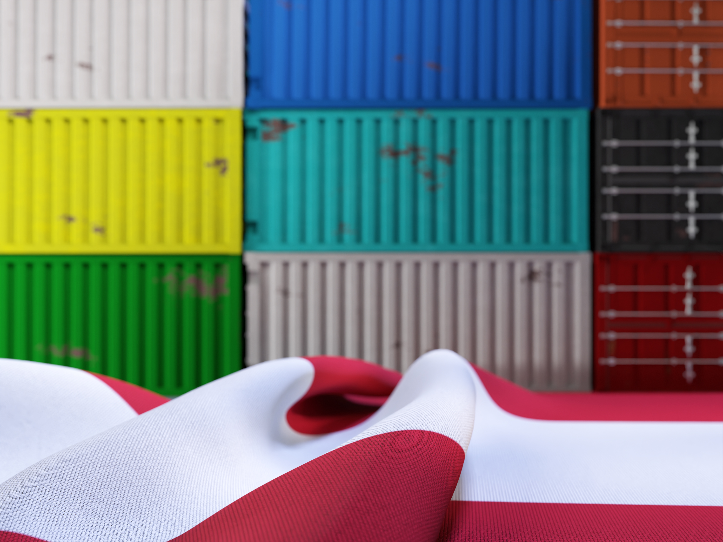 Wrinkled Flag of Austria in Front of Shipping Containers