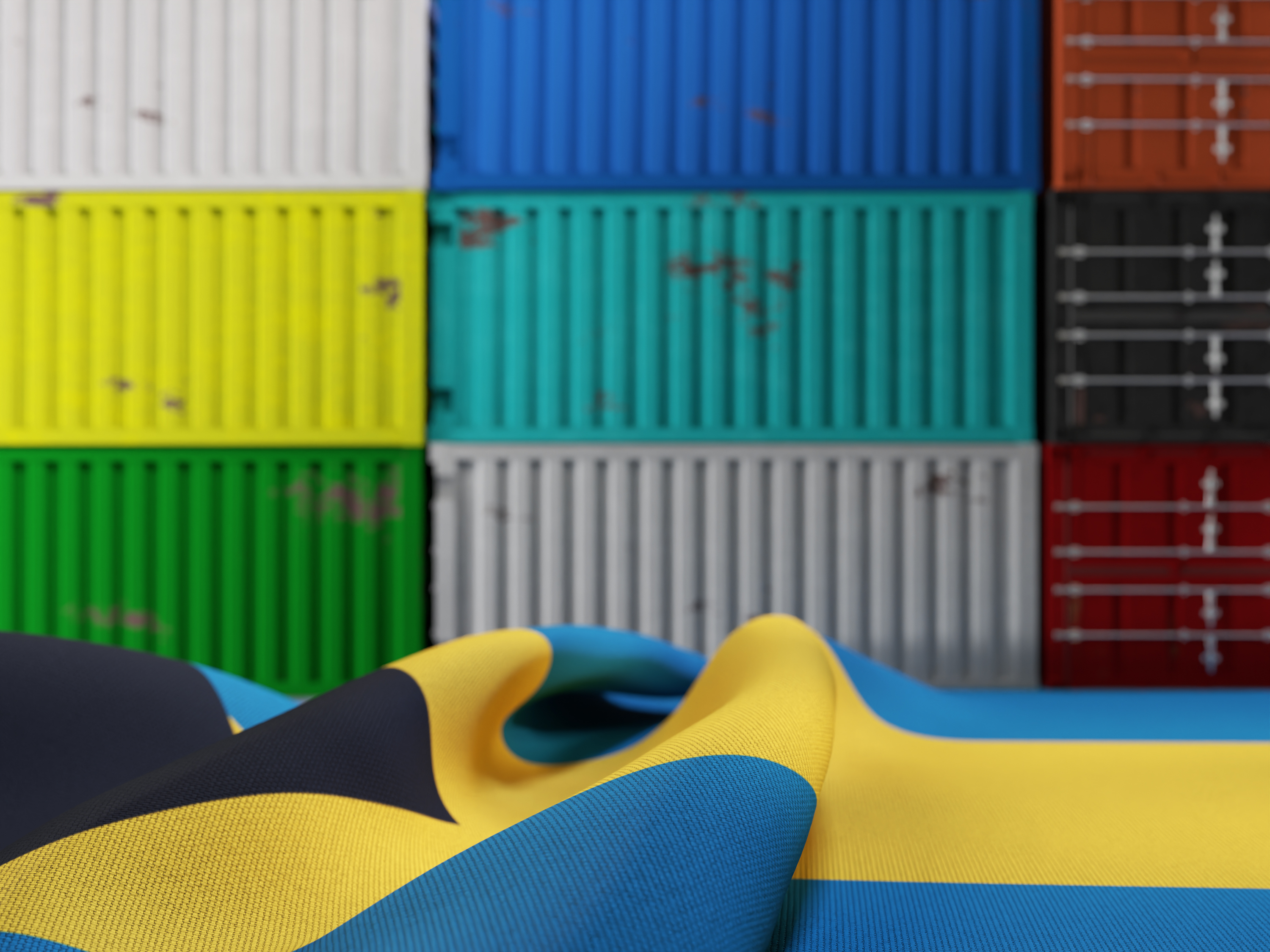 Wrinkled Flag of Bahamas in Front of Shipping Containers