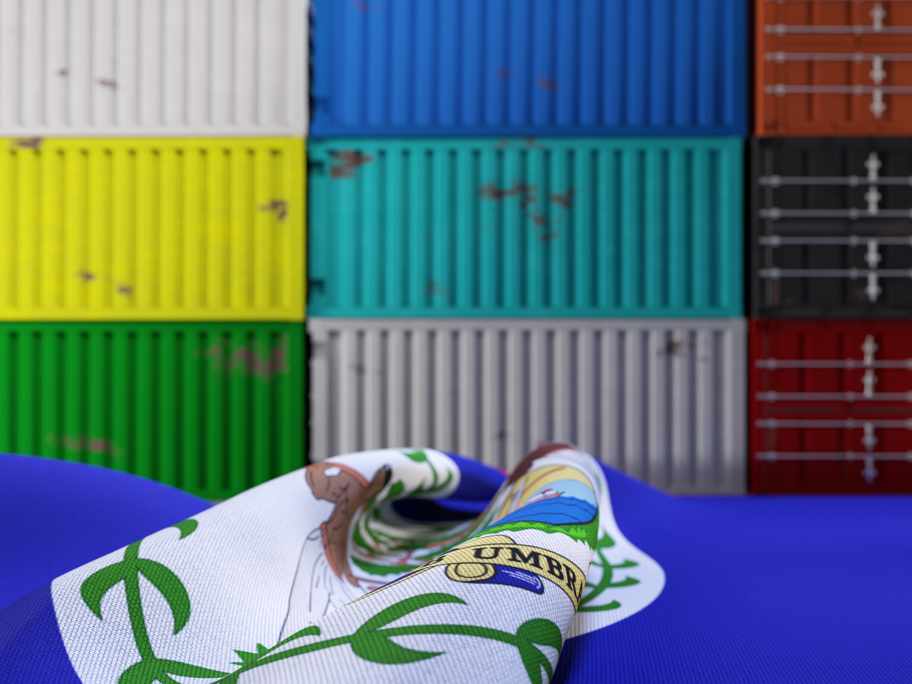 Wrinkled Flag of Belize in Front of Shipping Containers