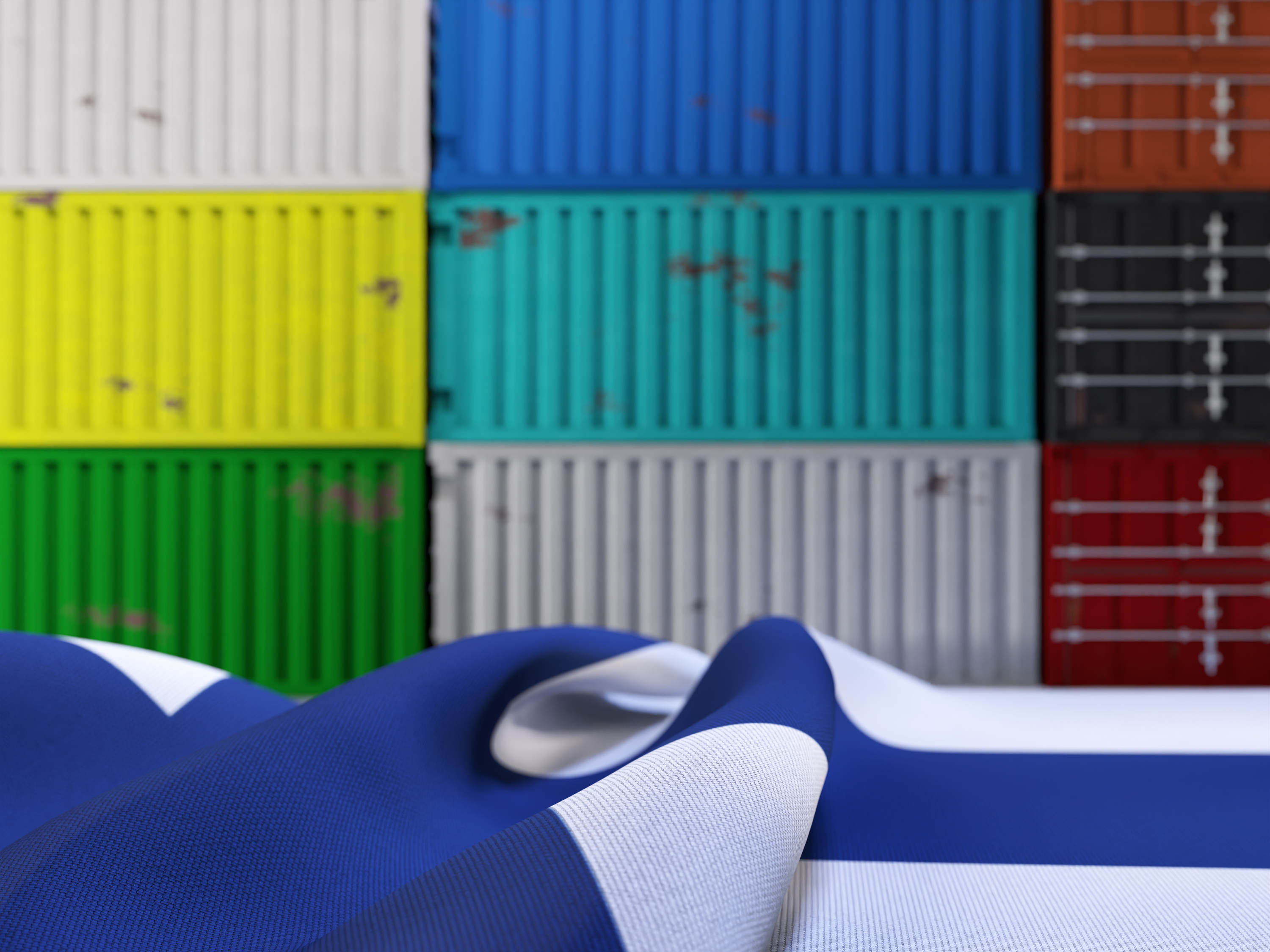 Wrinkled Flag of Finland in Front of Shipping Containers