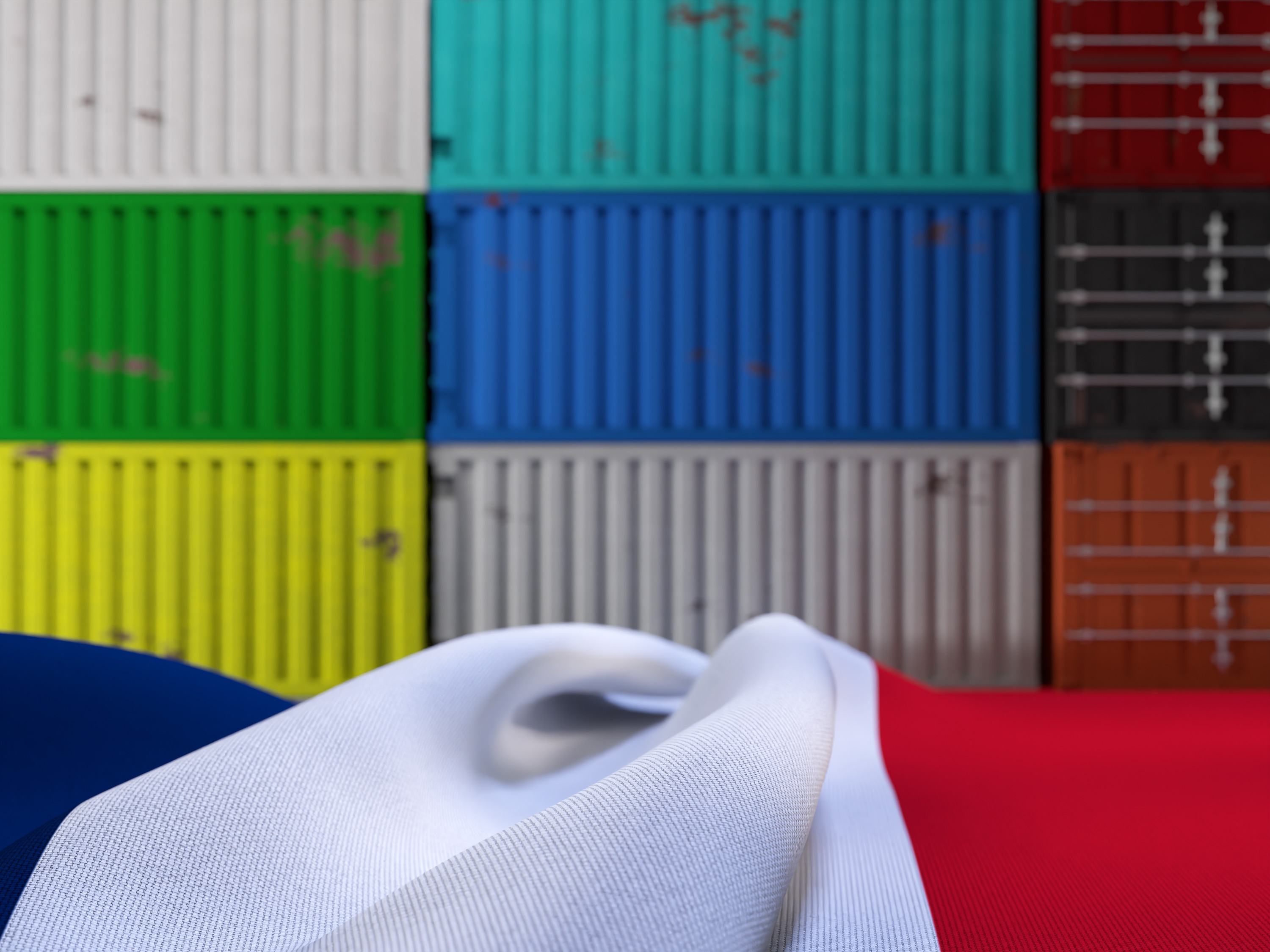 Collection: Wrinkled Flag of Countries in Front of Shipping Containers