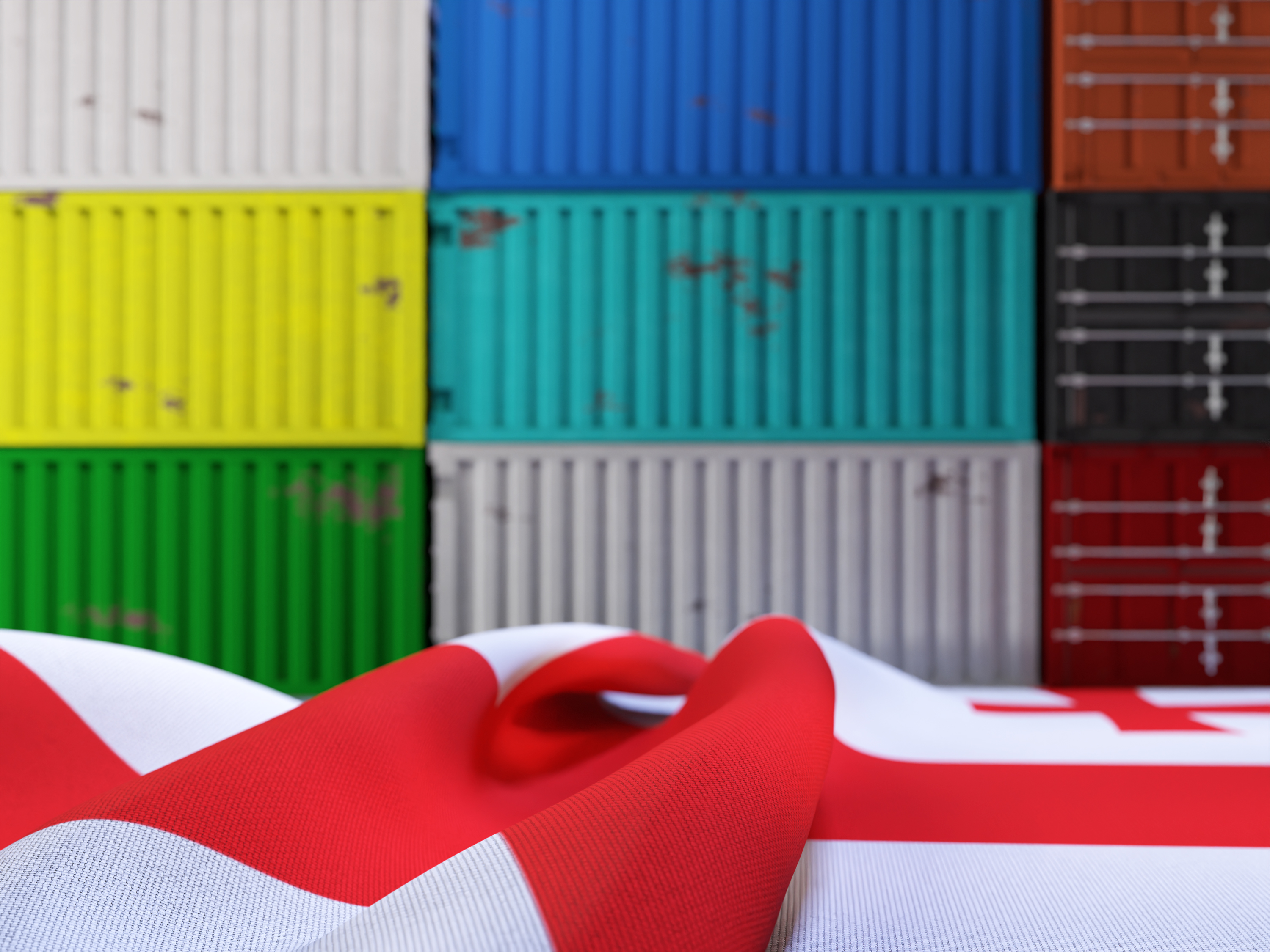 Wrinkled Flag of Georgia in Front of Shipping Containers