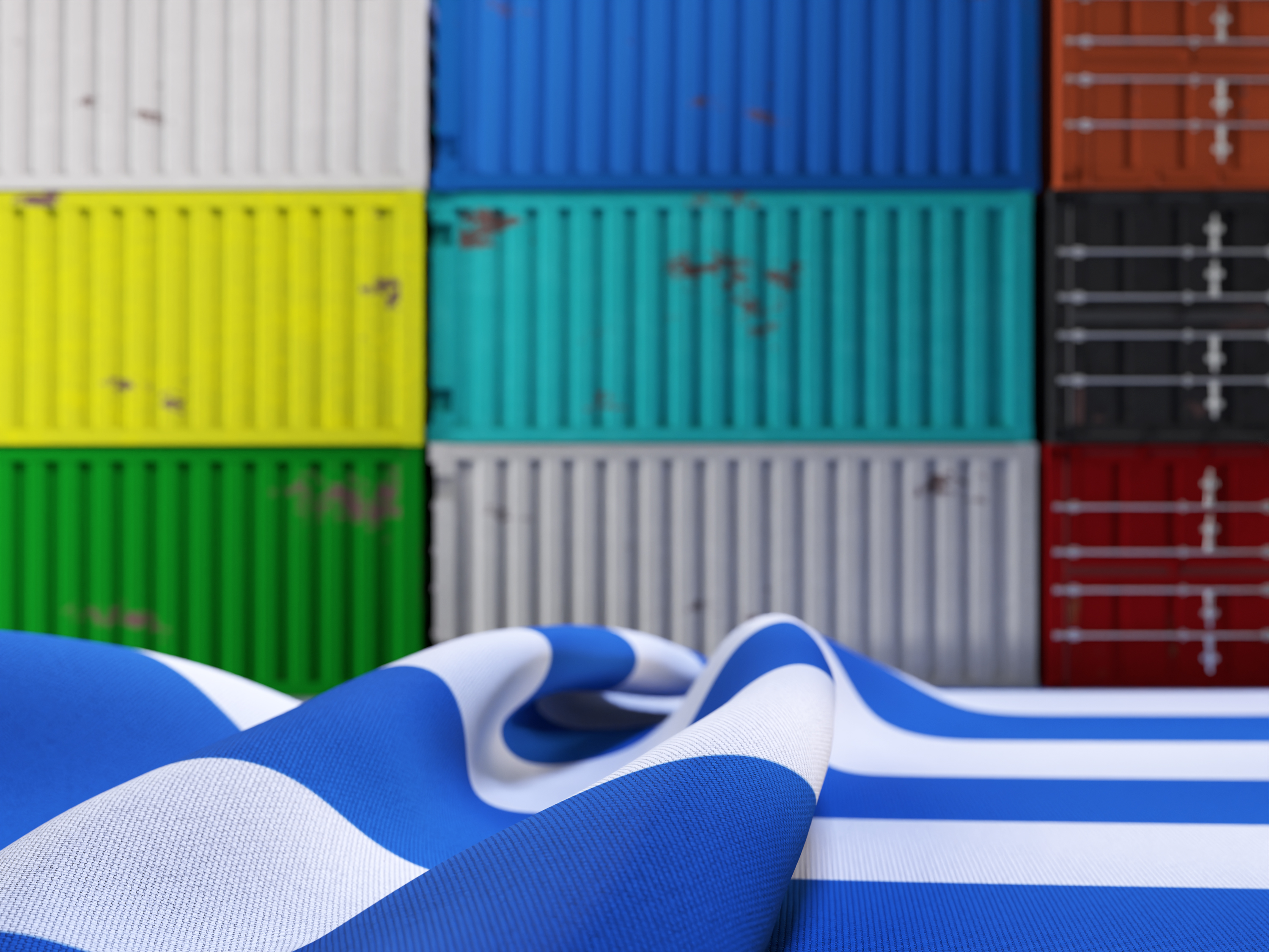 Wrinkled Flag of Greece in Front of Shipping Containers