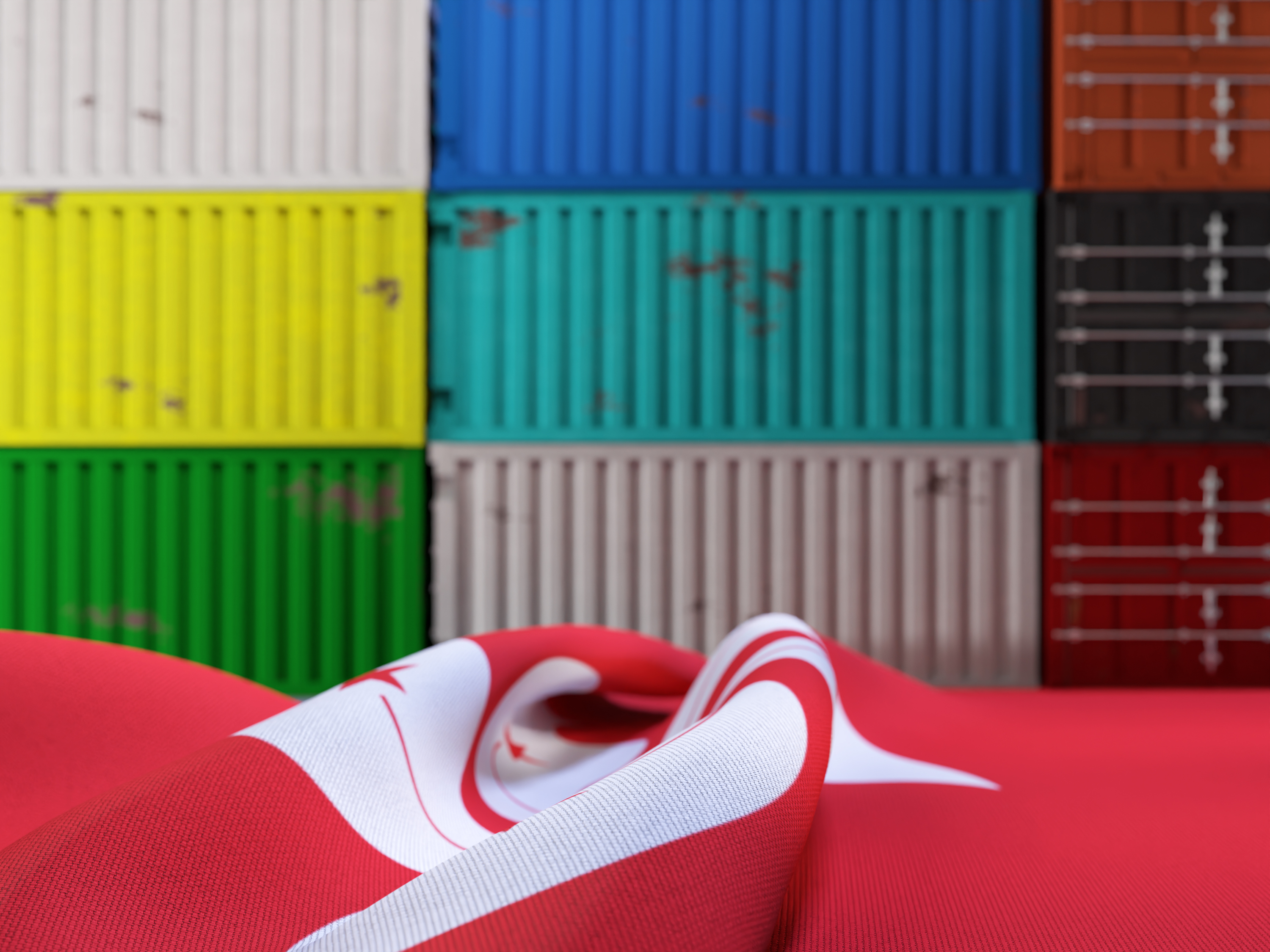 Collection: Wrinkled Flag of Countries in Front of Shipping Containers