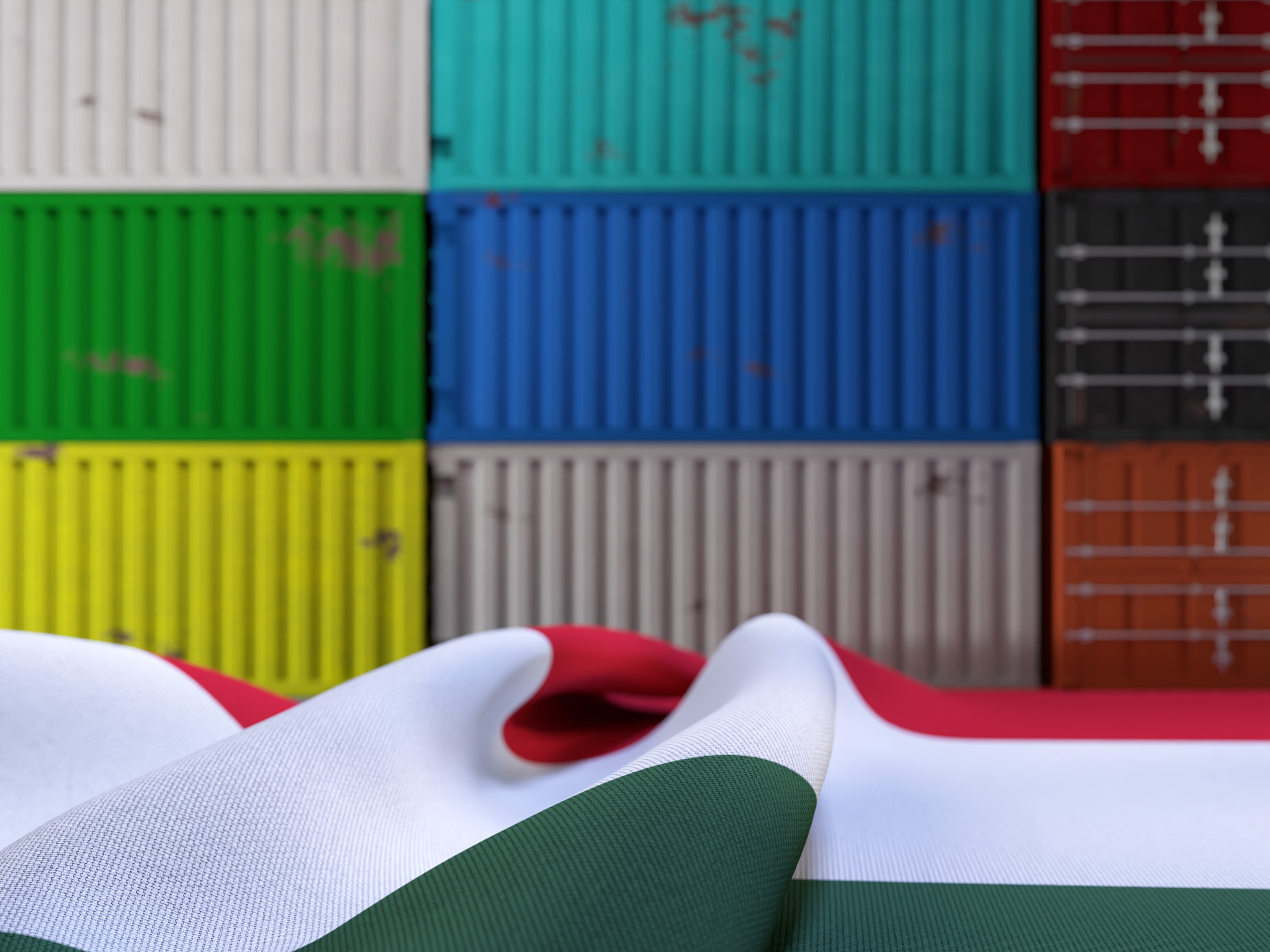 Collection: Wrinkled Flag of Countries in Front of Shipping Containers