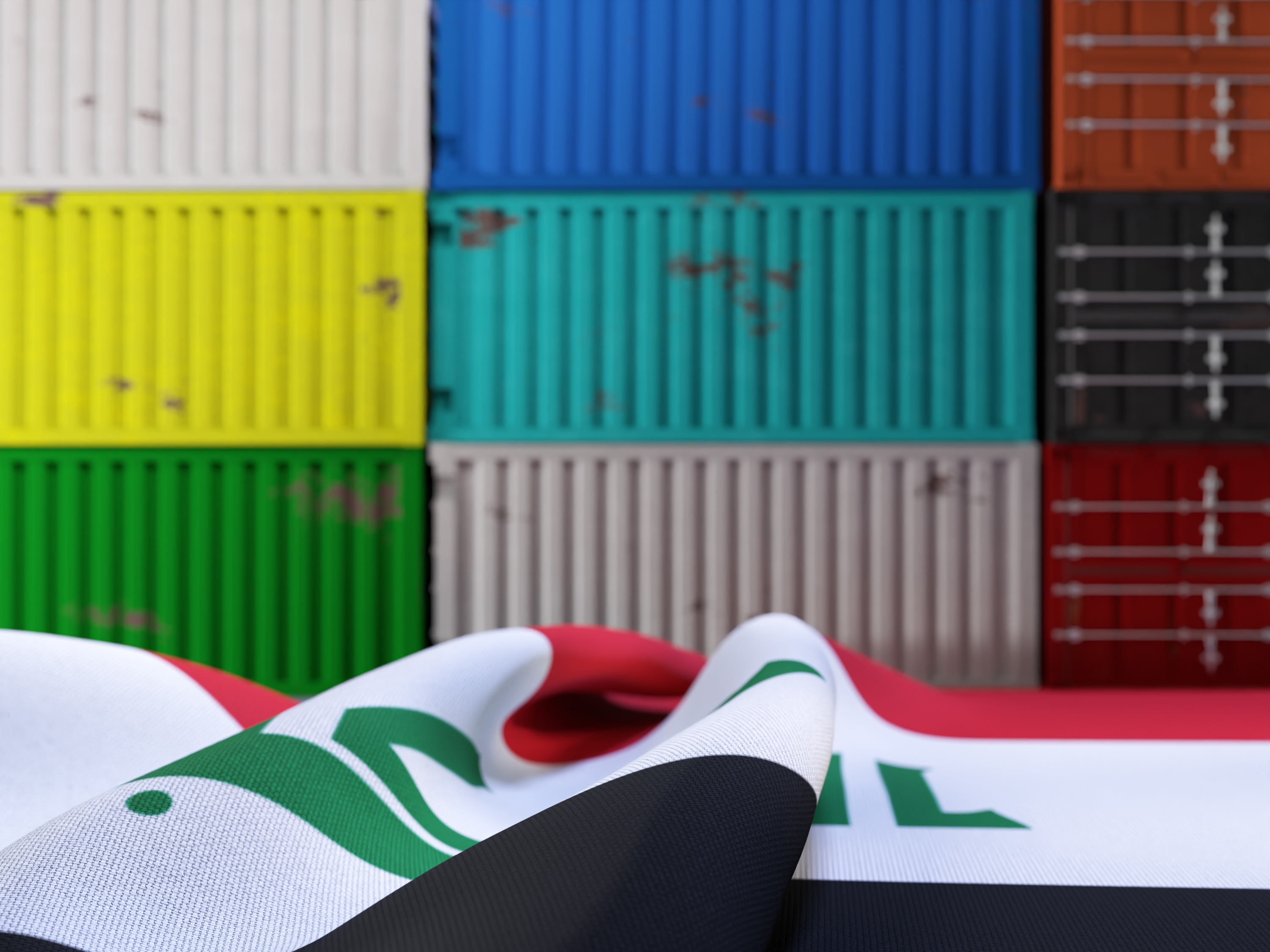 Wrinkled Flag of Iraq in Front of Shipping Containers