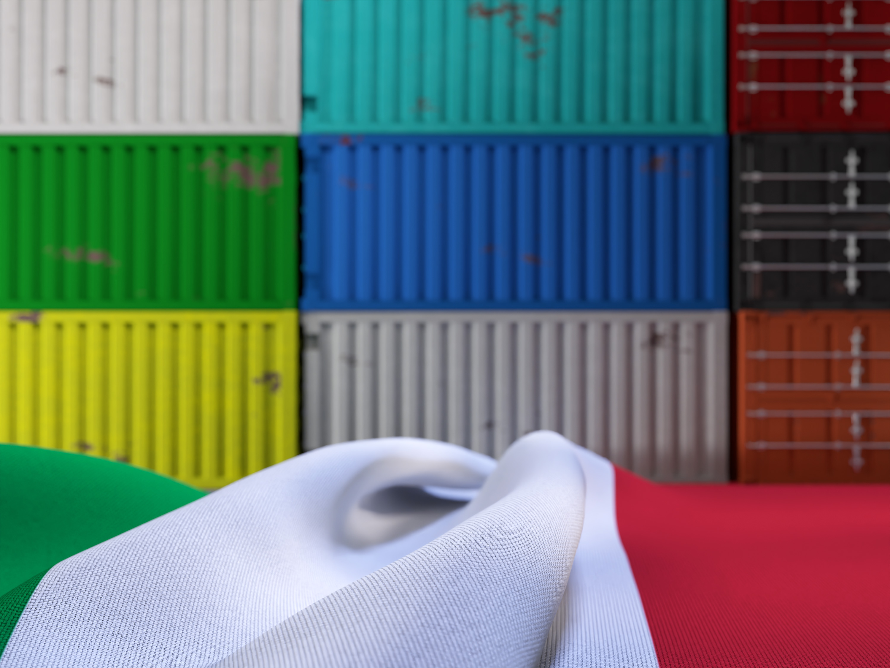 Collection: Wrinkled Flag of Countries in Front of Shipping Containers