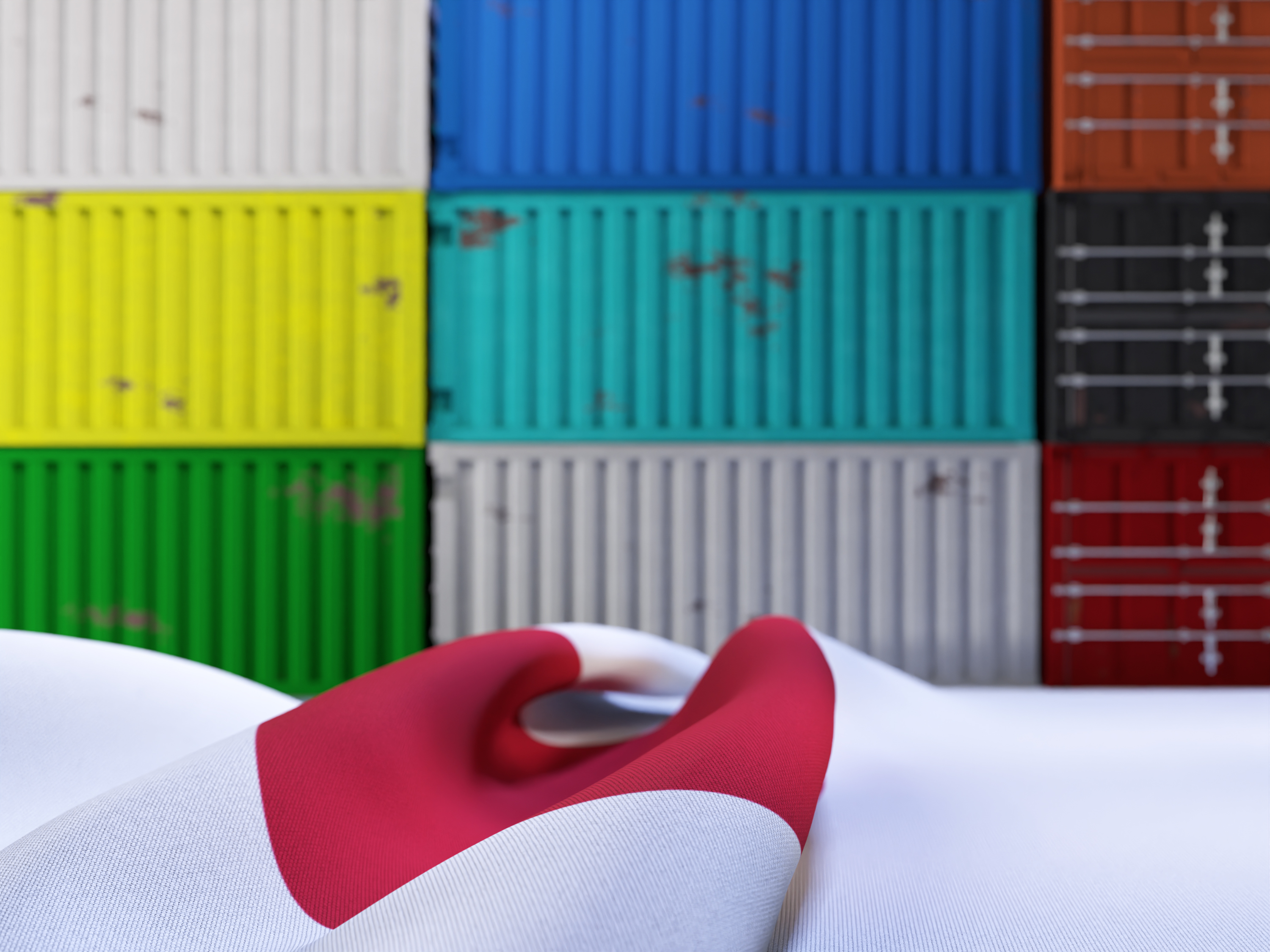 Wrinkled Flag of Japan in Front of Shipping Containers