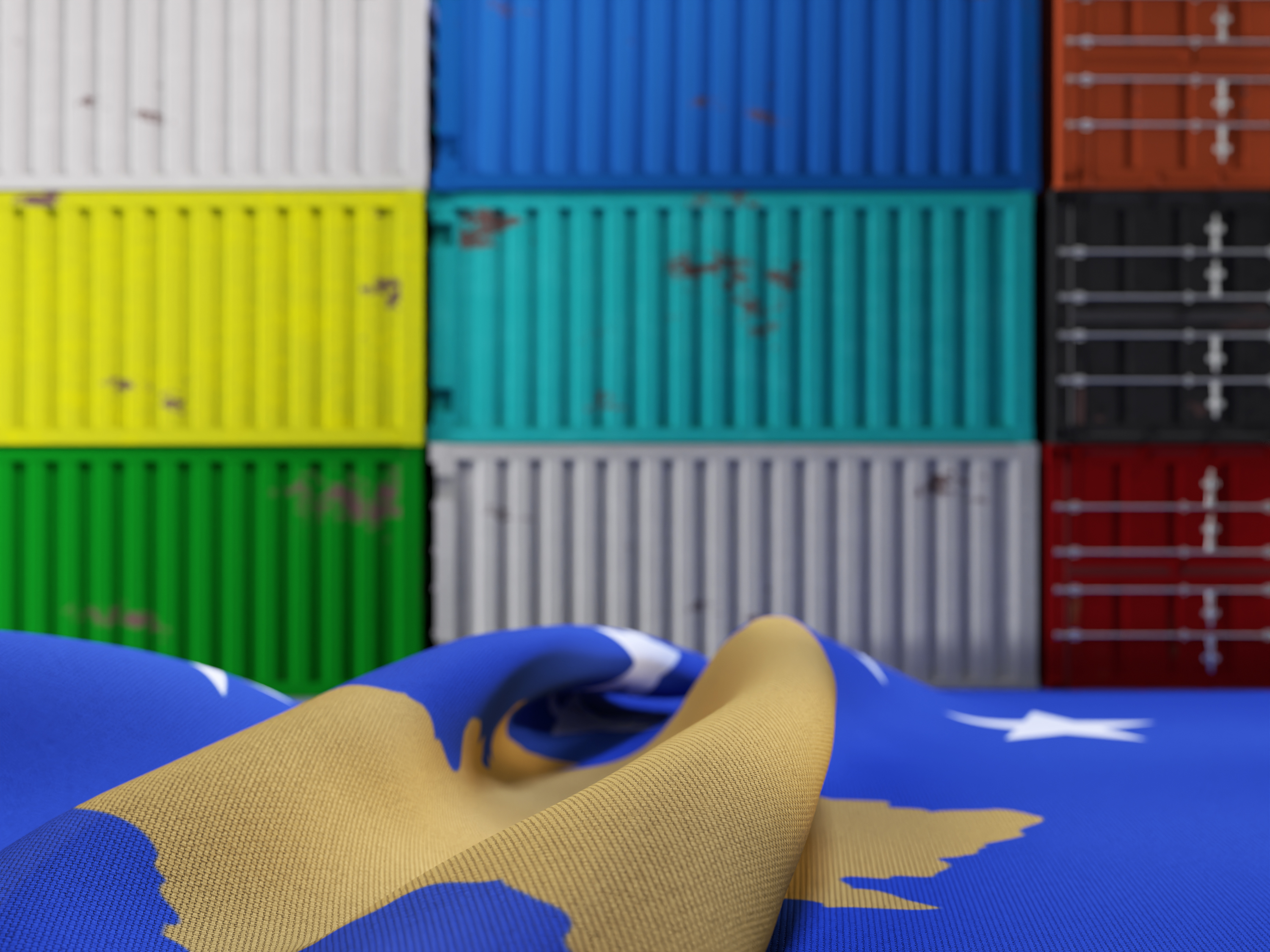 Wrinkled Flag of Kosovo in Front of Shipping Containers
