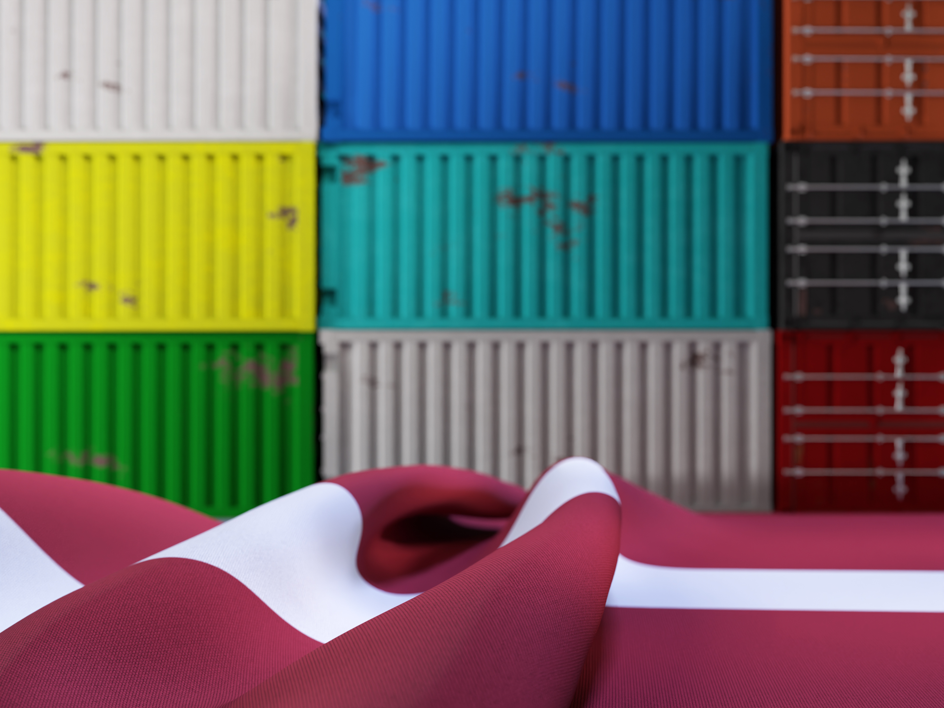 Wrinkled Flag of Latvia in Front of Shipping Containers
