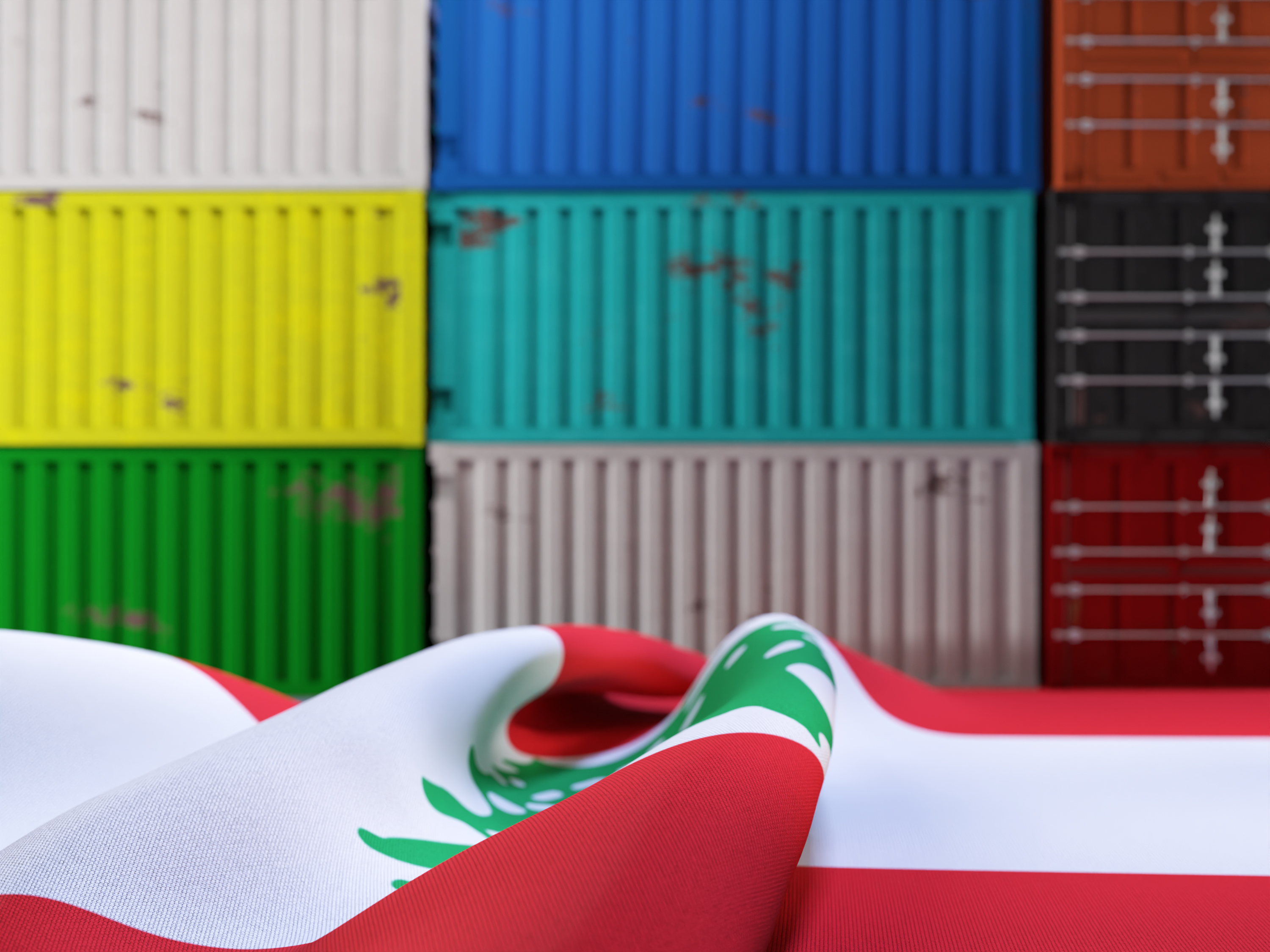 Wrinkled Flag of Lebanon in Front of Shipping Containers