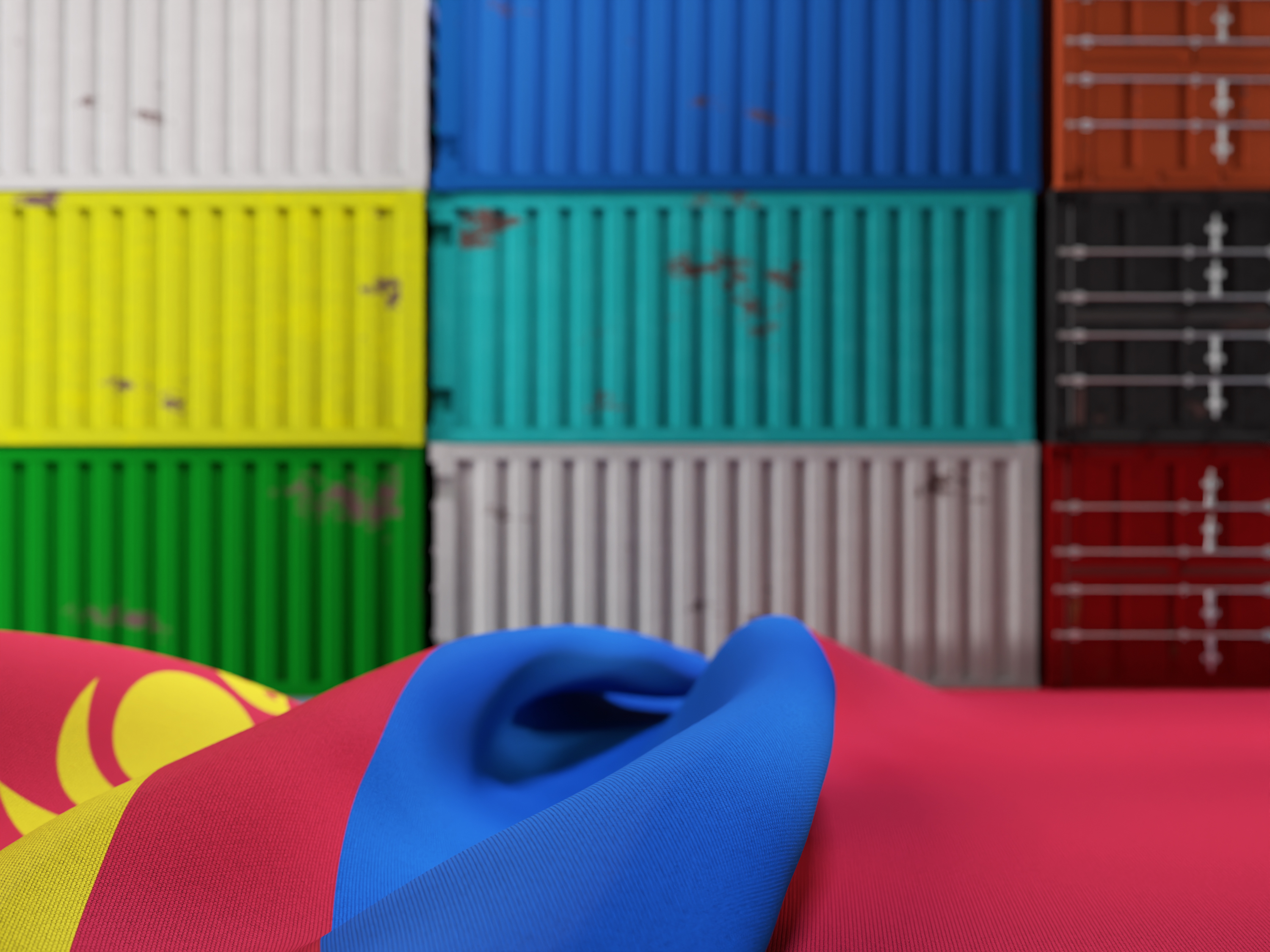 Wrinkled Flag of Mongolia in Front of Shipping Containers