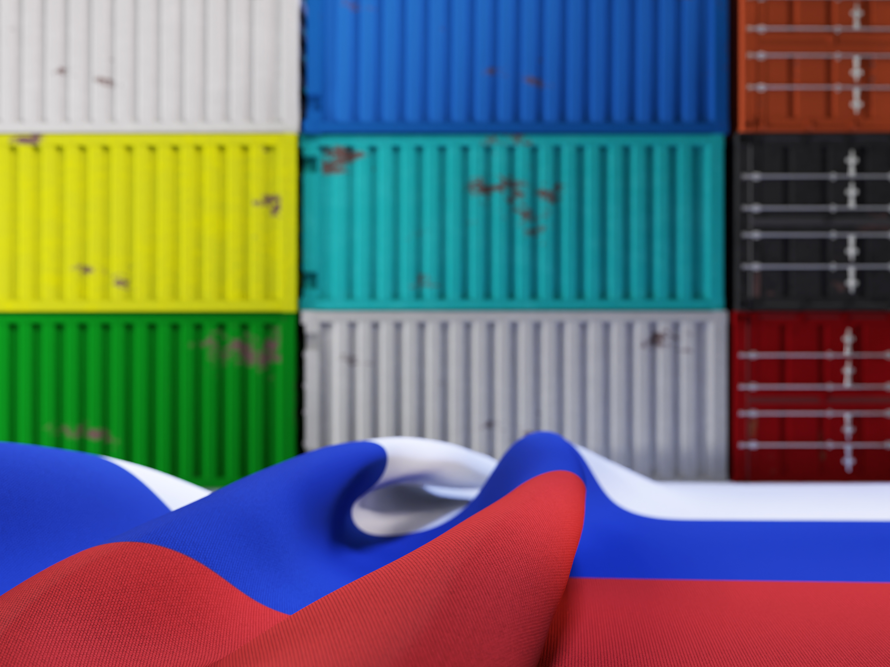 Wrinkled Flag of Russia in Front of Shipping Containers