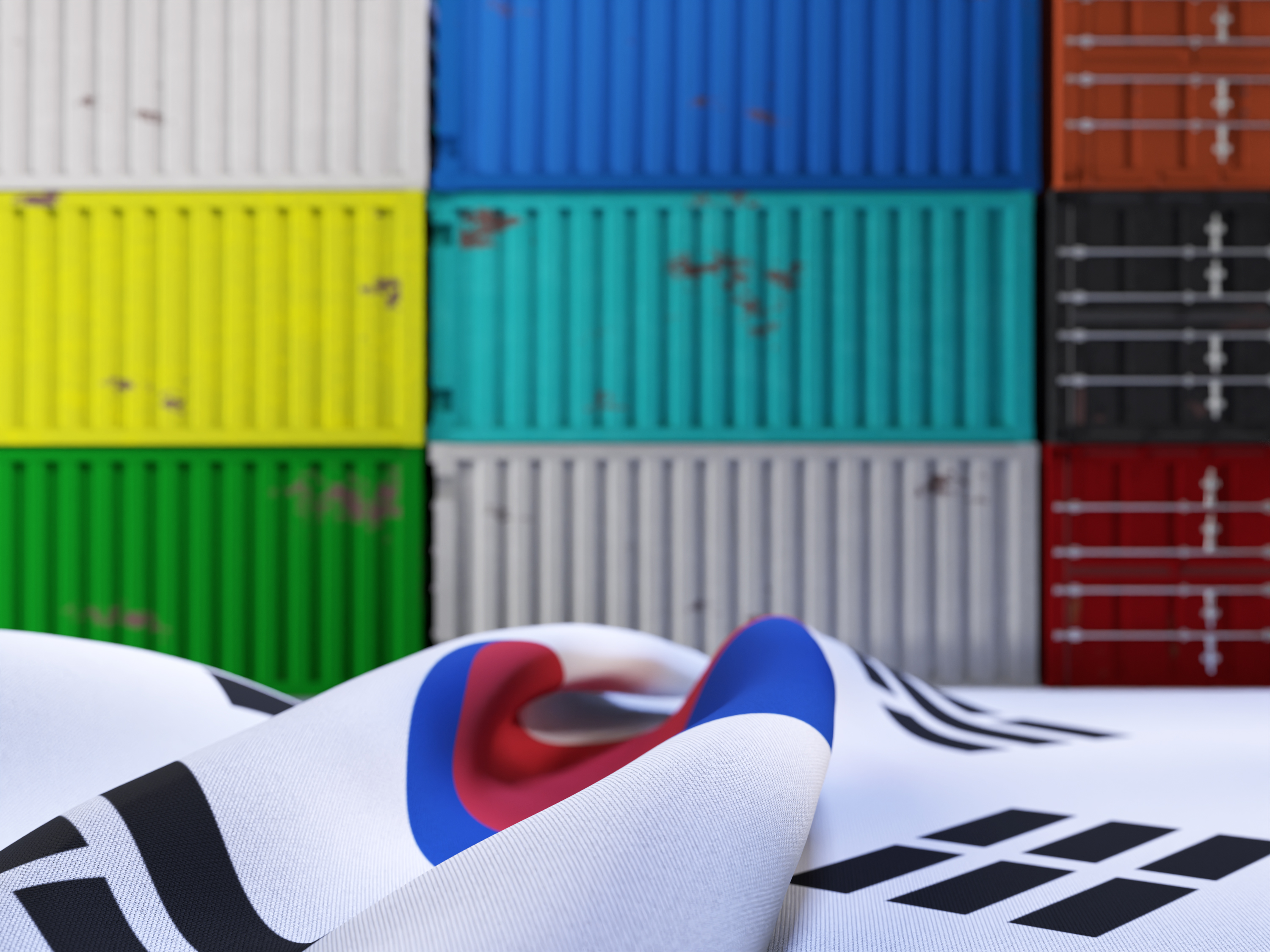 Wrinkled Flag of South Korea in Front of Shipping Containers