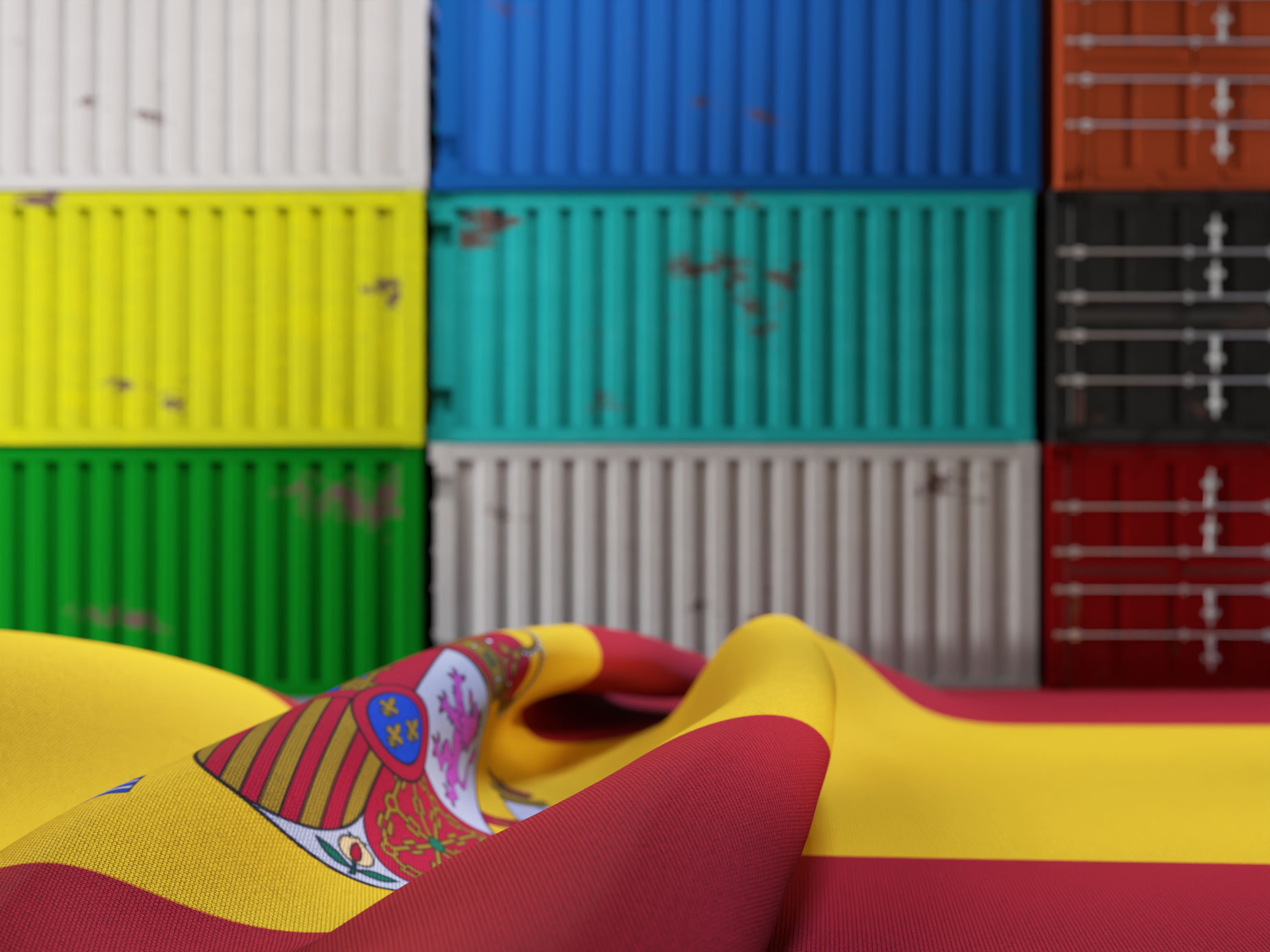 Wrinkled Flag of Spain in Front of Shipping Containers