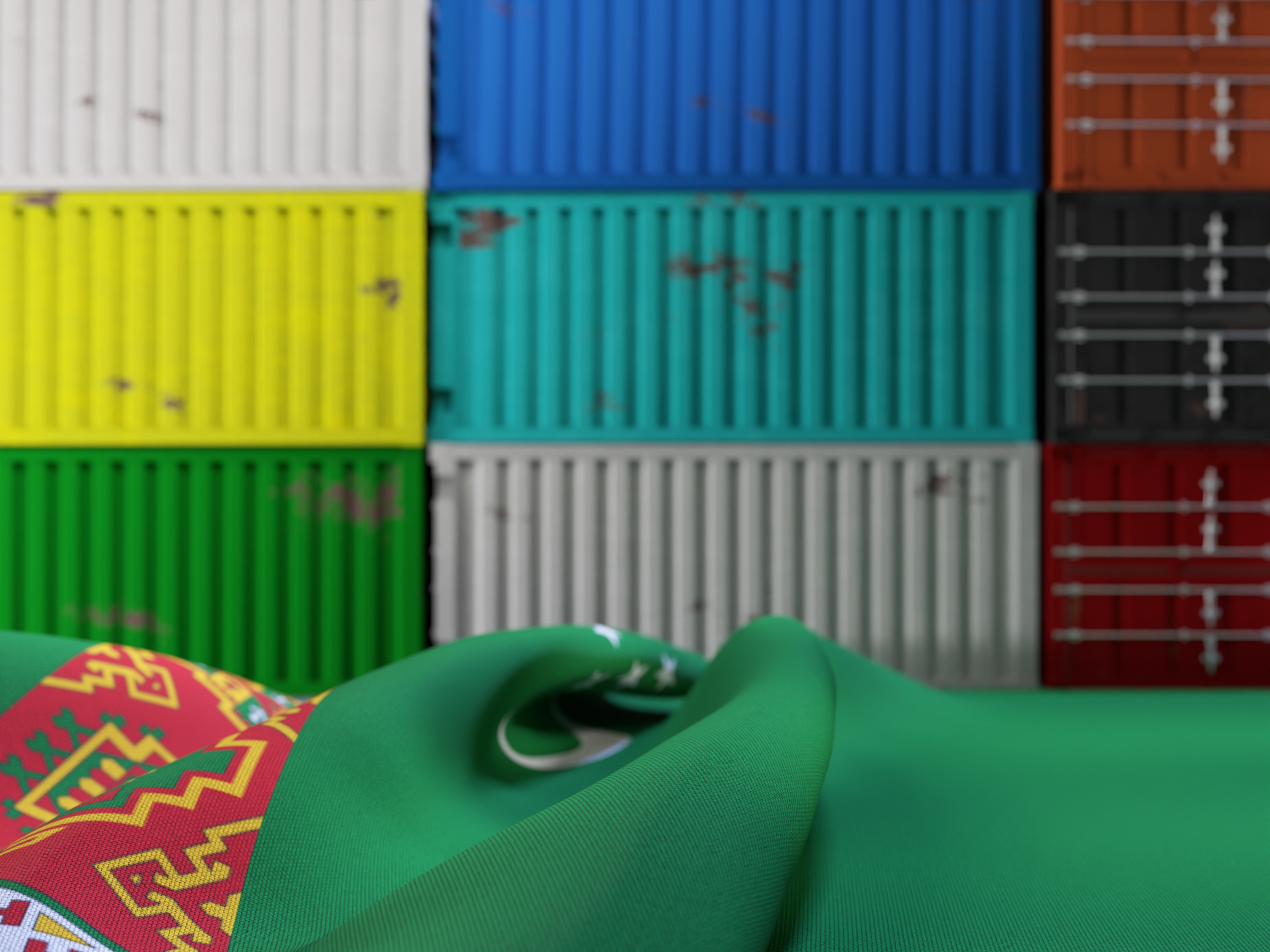 Wrinkled Flag of Turkmenistan in Front of Shipping Containers