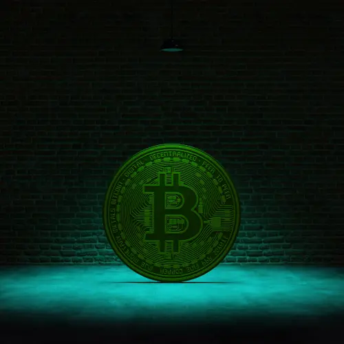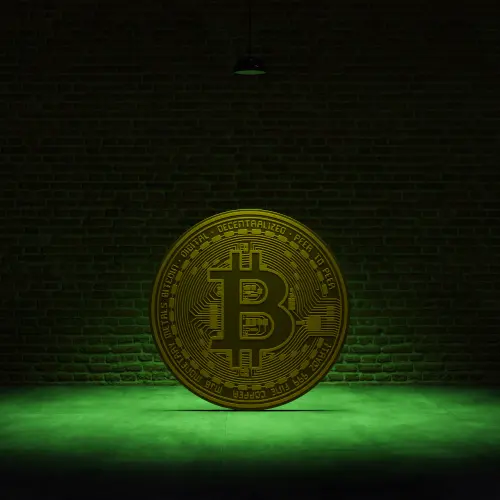 Golden Bitcoin under a green spotlight in front of a brick wall