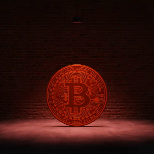 Golden Bitcoin under a red spotlight in front of a brick wall