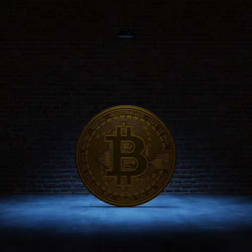 Golden Bitcoin under a blue spotlight in front of a brick wall
