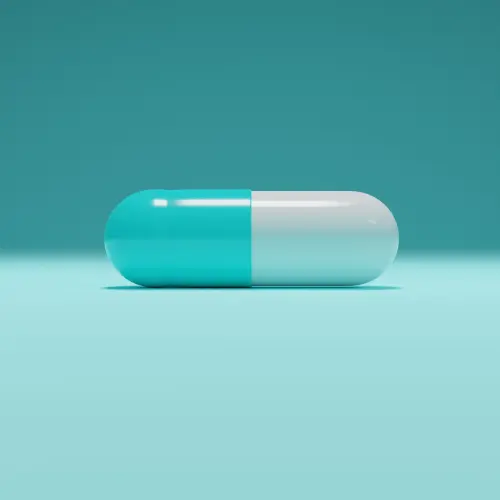 Vitamin K With Red Capsule, Granules and Turqoise Background